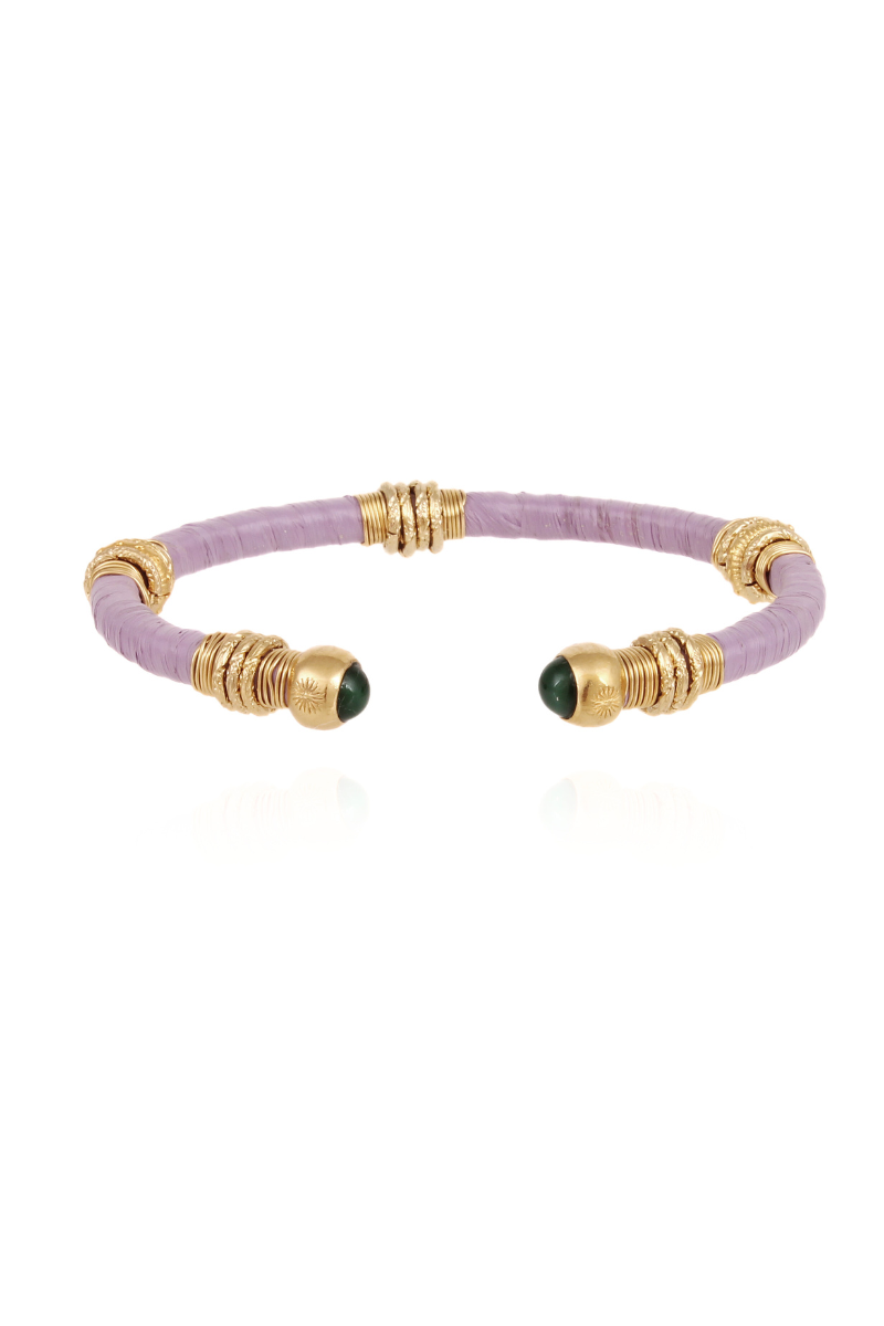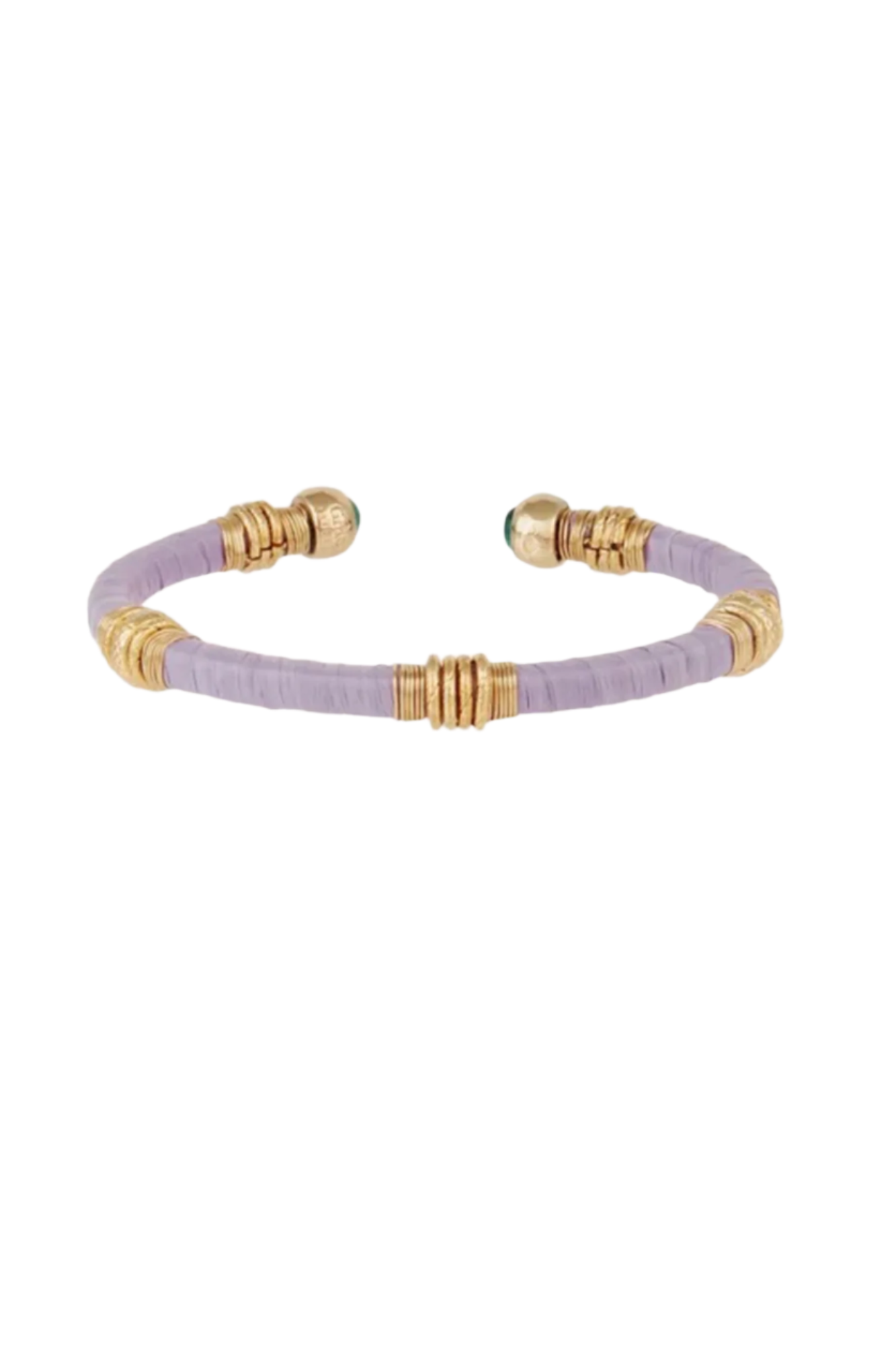 Fine acetate bangle bracelet wrapped in coloured raffia and gold plated rings. This bracelet is ended by two golden balls. This luxurious and adjustable accessory is perfect for creating a sophisticated and exclusive arm candy. Stack it with other bracelets for a stylish summer look.