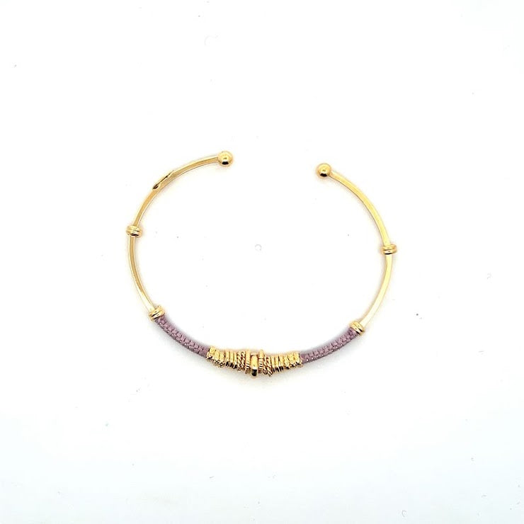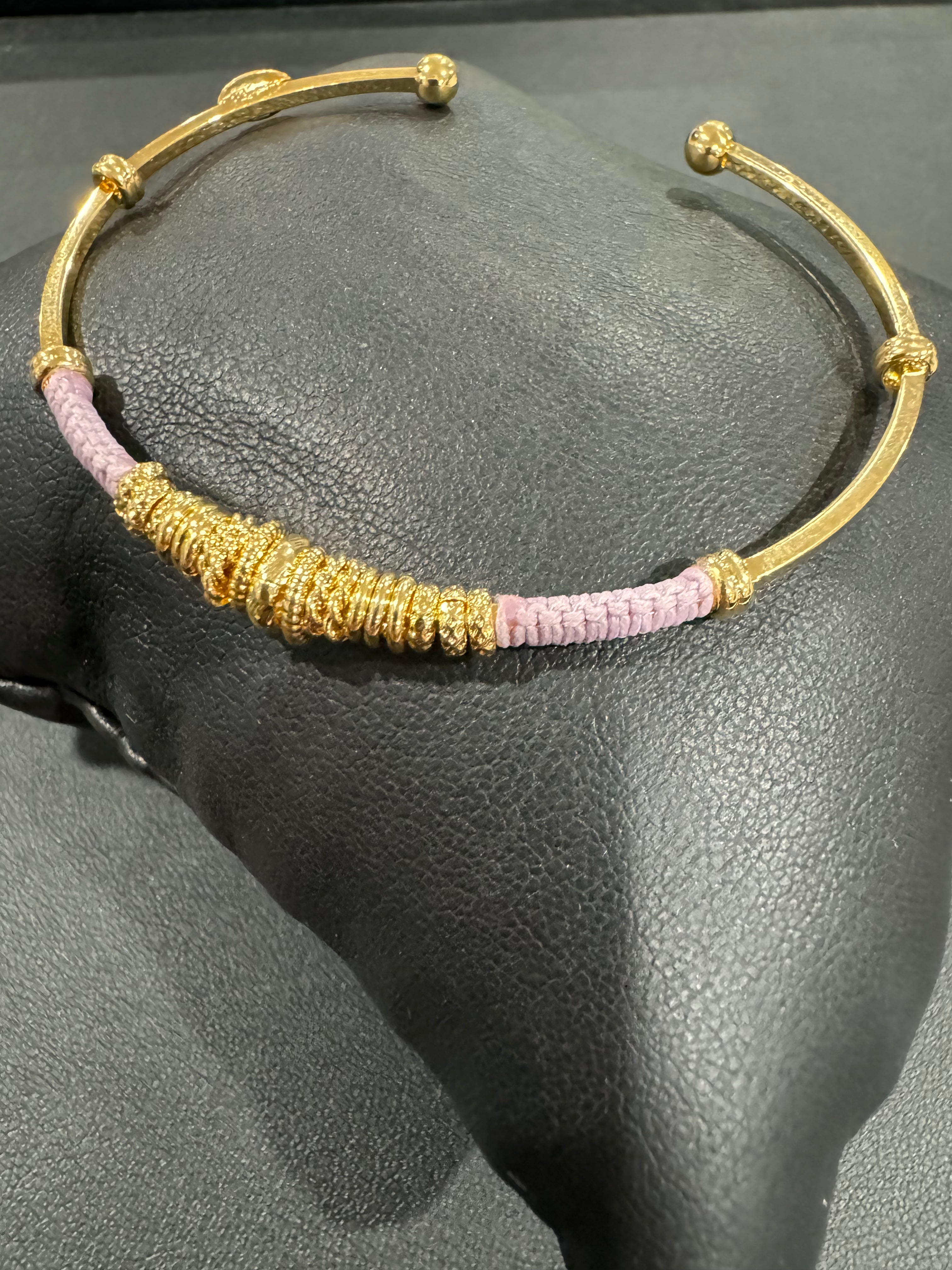Gold plated bangle/cuff, wrapped in part by coloured threads and golden rings. For a lucky charm, we recommend wearing it with other bracelets to create the perfect combination.