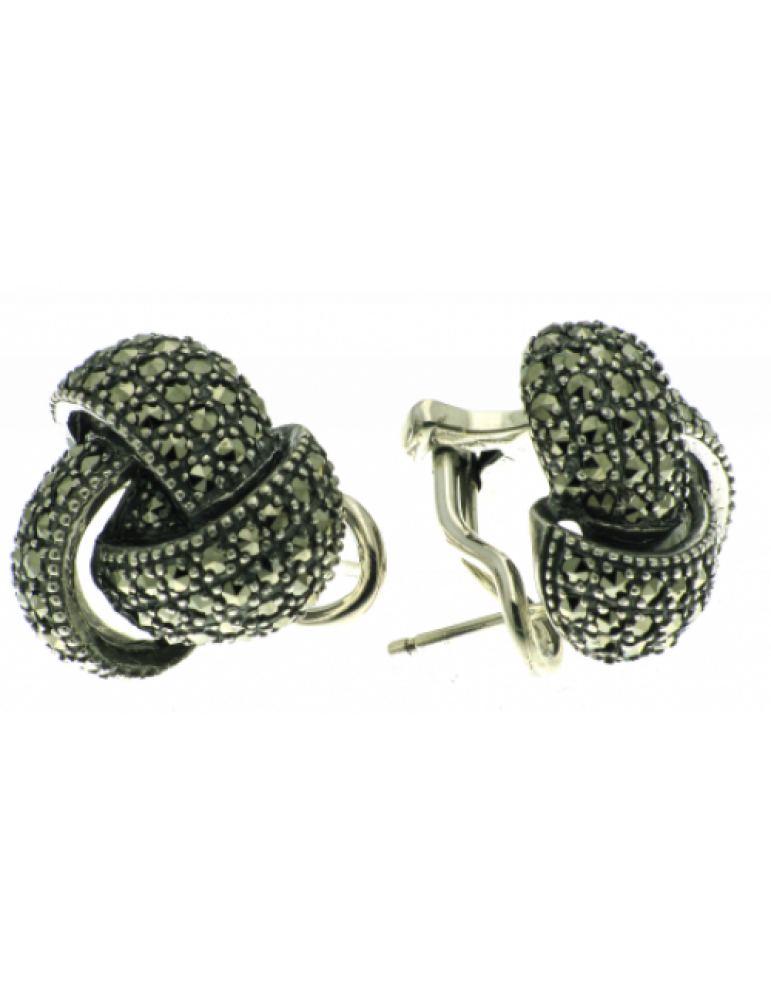 Sterling silver wool knot earring with hand set marcasite. Omega stud clip-on measures 16 mm.
