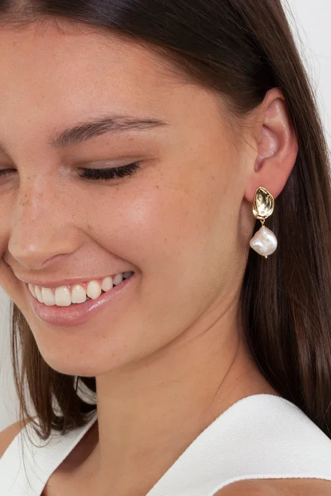 With a unique hammered oval stud and flat baroque freshwater pearls, the Atlantic Earrings from Bianc take cues from modern sculpture and organic shapes.