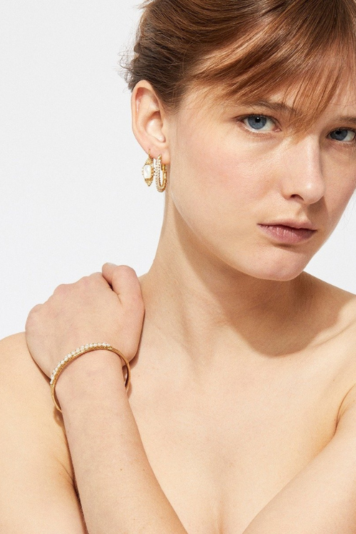 Gas Bijoux's Lyre Stone Hoop Earrings is where artistry meets nature's allure. Crafted in 24kt gold-plated metal and adorned with pearls, these earrings offer a captivating blend of luxury and earthy elegance. Elevate your style with these unique hoops, designed to make a statement and infuse your look with timeless charm.