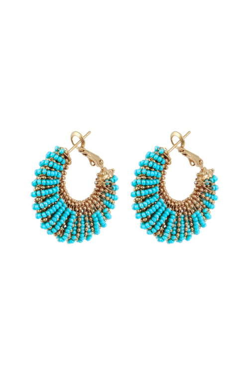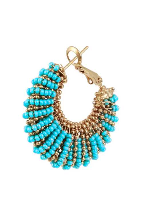 Gold plated earrings from our Izzia collection. They feature a thread of coloured turquoise beads that finely surrounds the entire structure of the earring. They are handmade in our Marseille workshop.