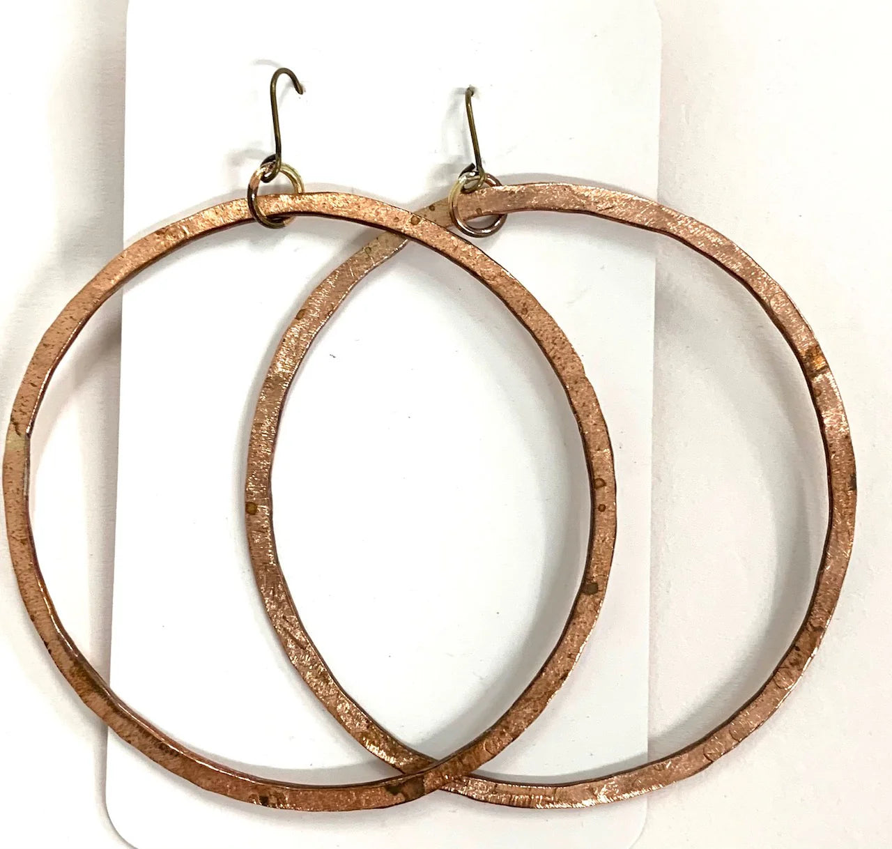 Large hoop copper earrings, supplied on antique brass hooks (natural anti-bacterial properties), also available in silver. Approx. 6cm length.