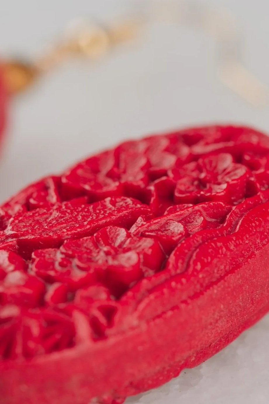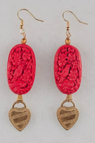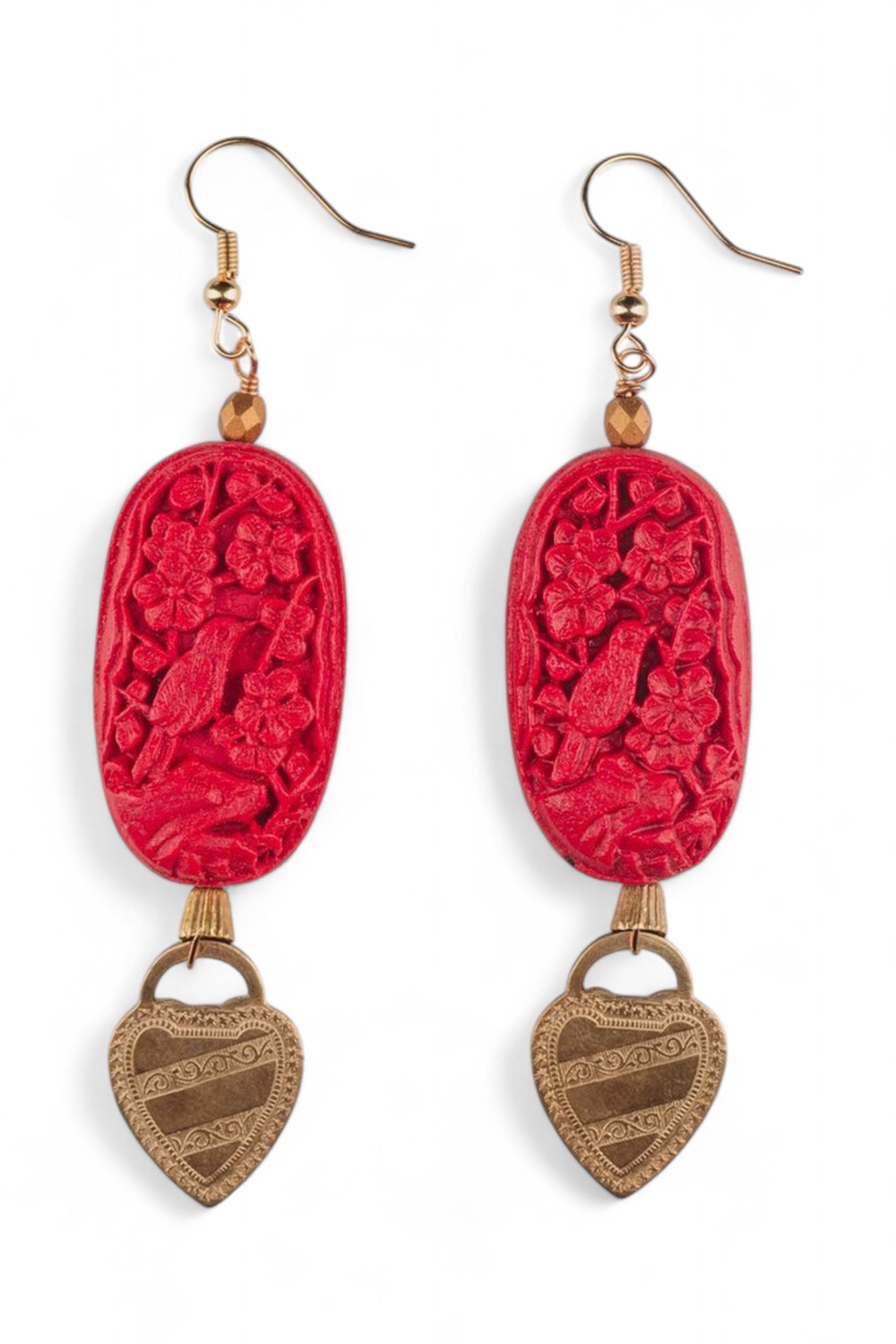 Vintage carved Asian oval featuring a stunning Nightingale amongst the flowers and hung with a gorgeous vintage golden adorned heart. Light to wear but delightful to view. Handmade in Australia with 18 carat gold plated Ear posts.