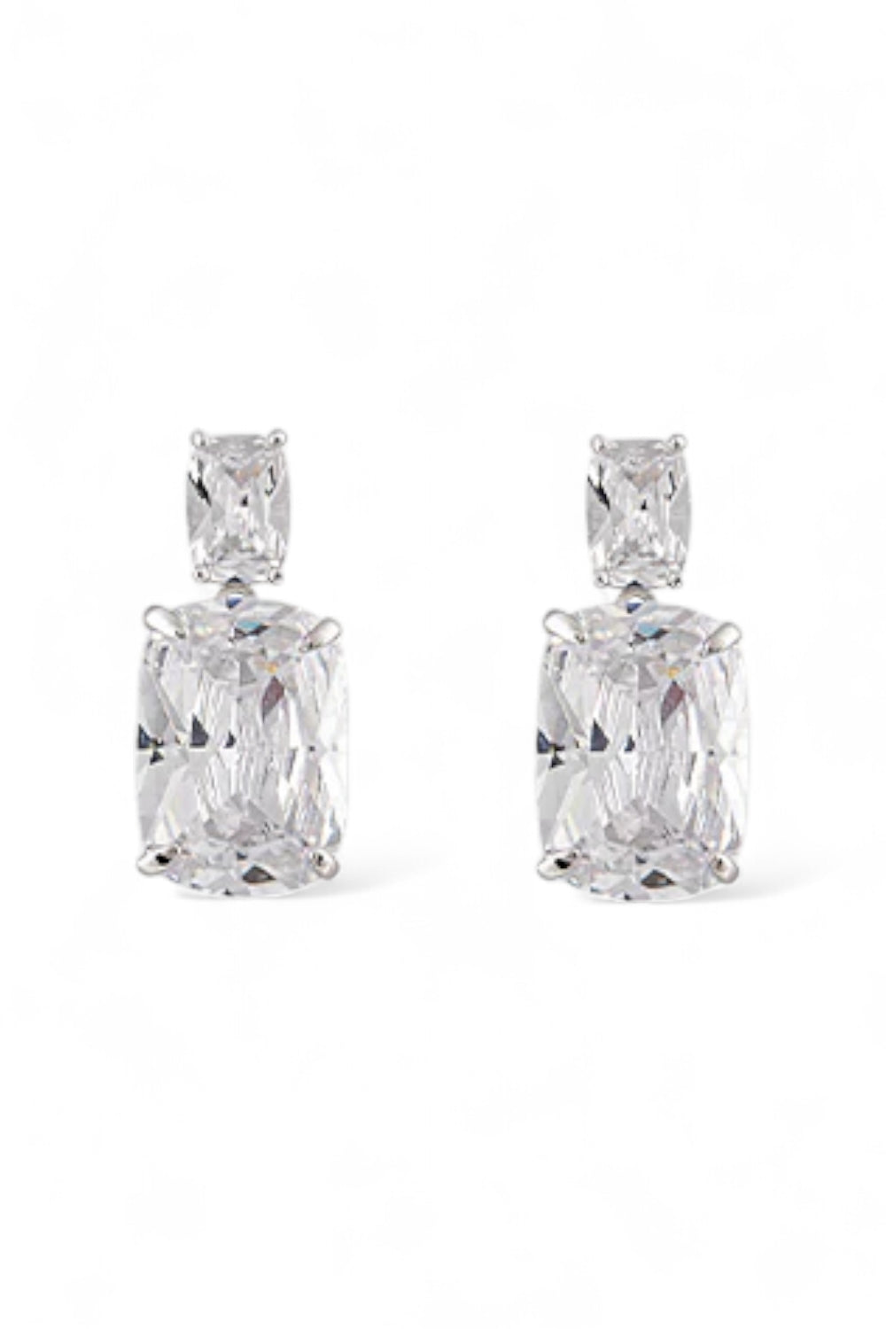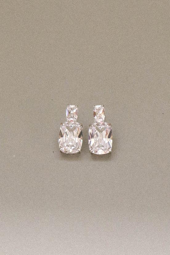 The Nova Earrings by Bianc feature a classic double-drop style with a radiant cushion-cut cubic zirconia suspended below a sparkling square-cut smaller cubic zirconia stone, to add a dazzling touch of sparkle to your collection.