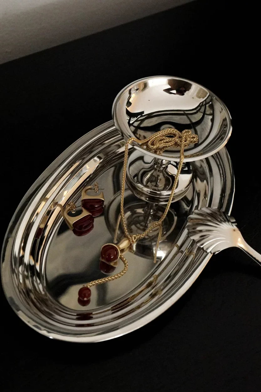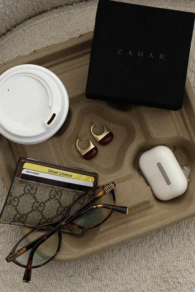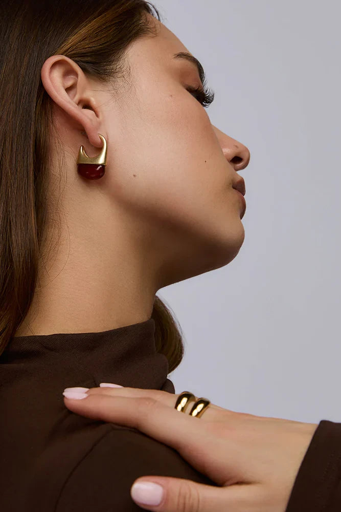 The Poppy Earrings by Zahar feature a gold arc that cradles a deep red resin drop. Artful and unexpected, this design is modern and playful - perfect for adding a creative edge to any outfit.
