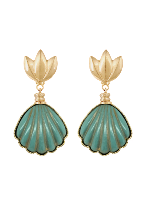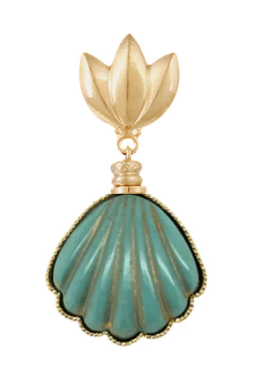 Add a touch of whimsy to any outfit with these gold plated Sanibel earrings. The fine stud accents the delicate white Mother-of-pearl shell or reconstituted turquoise, creating a unique statement piece.