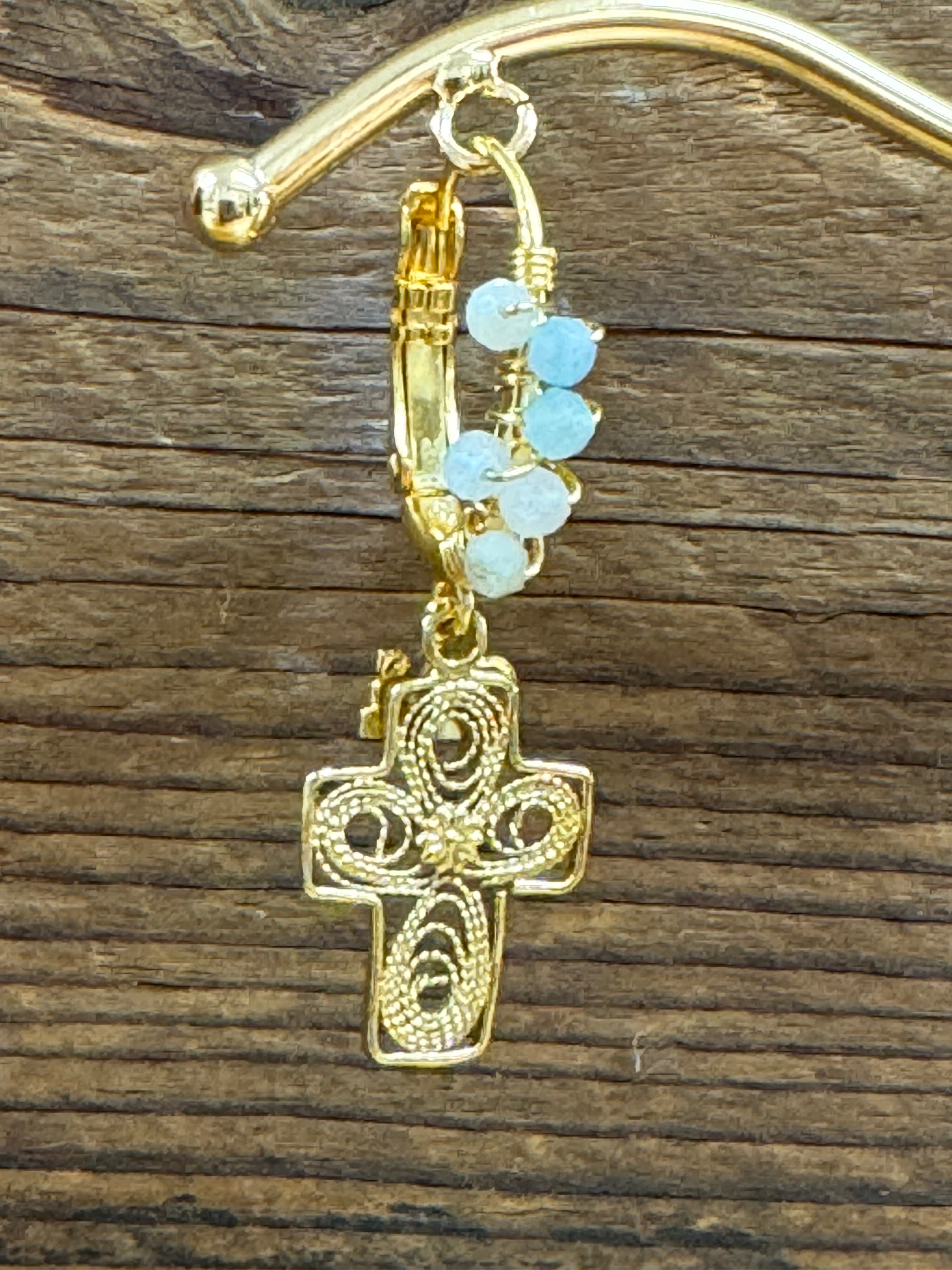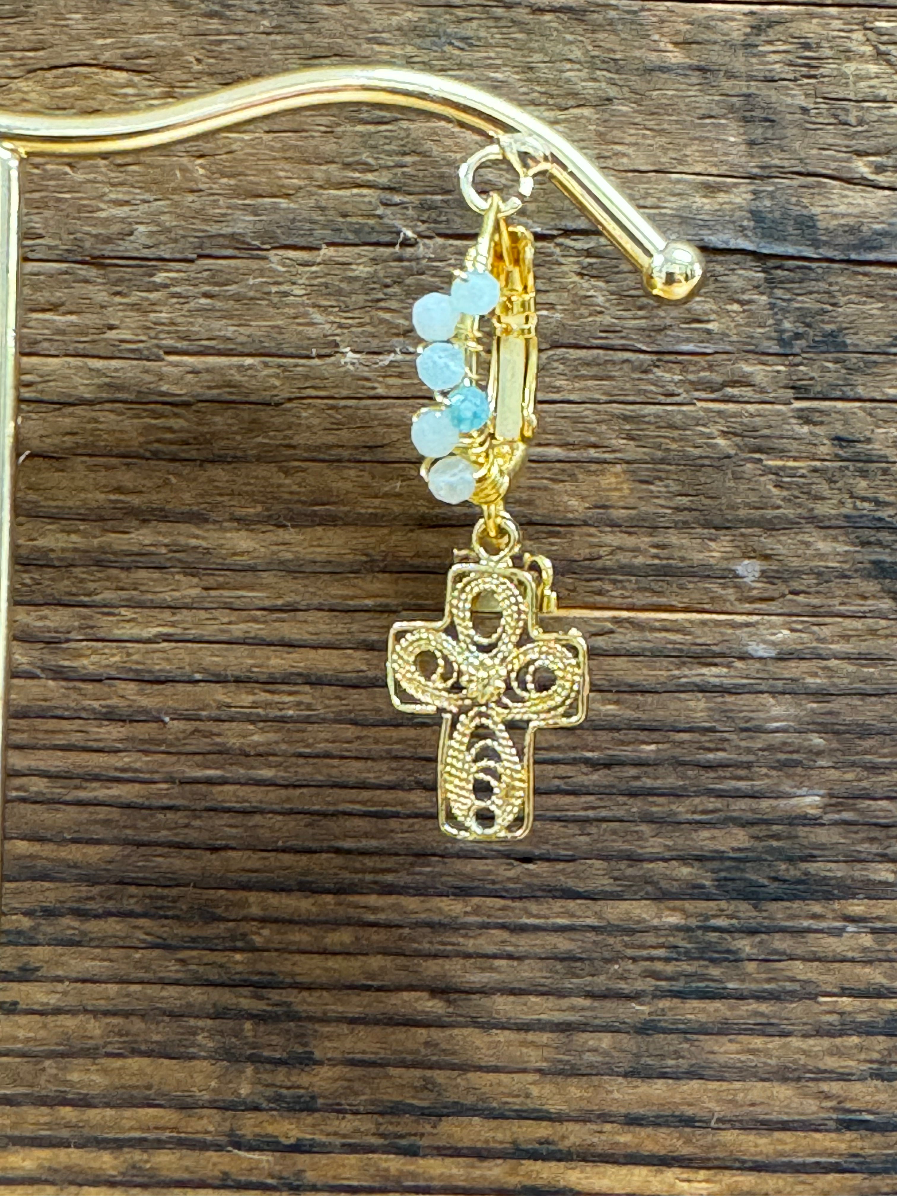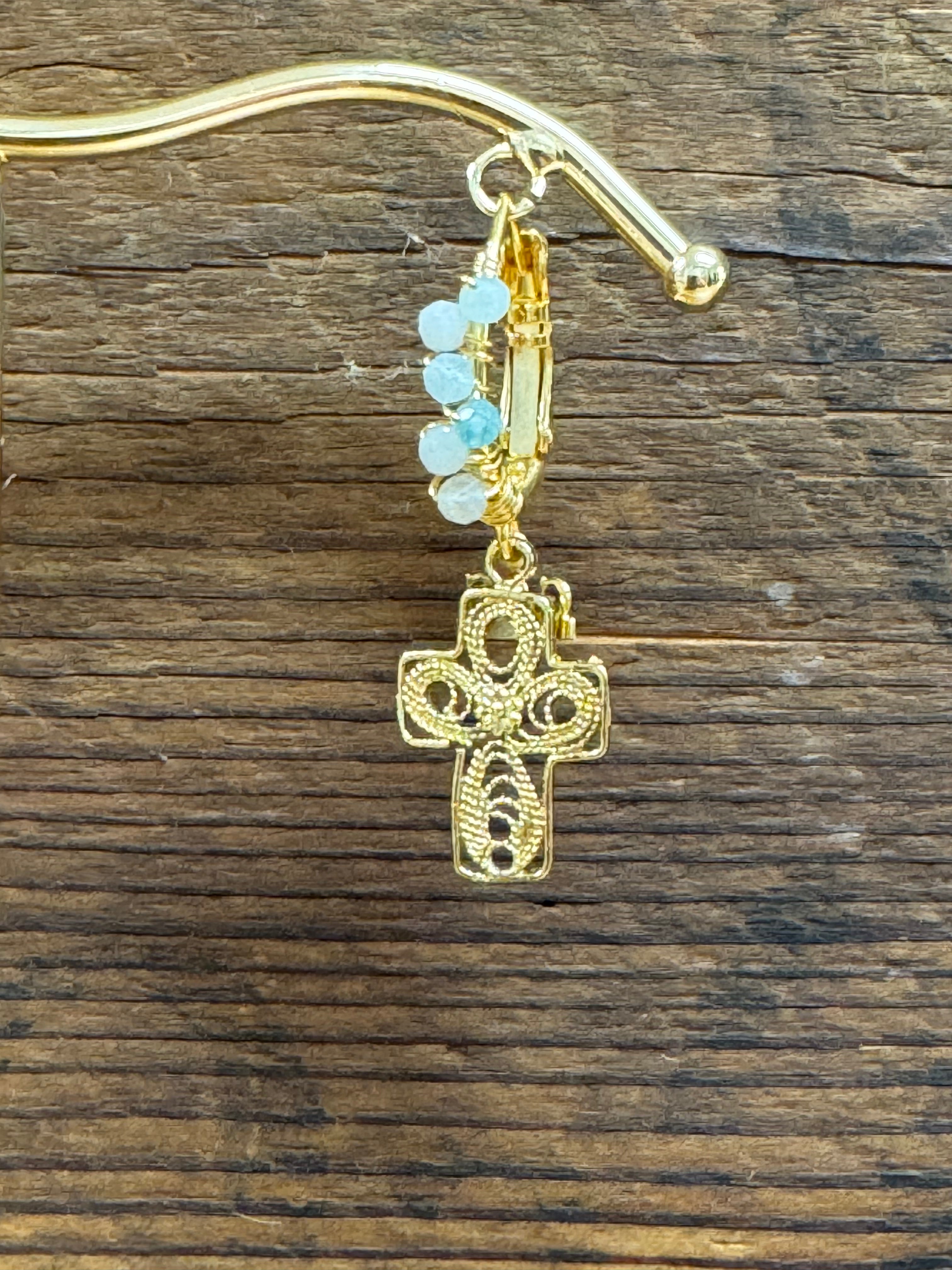 Gold-plated earrings featuring gemstones wrapped around the sleeper and a finely filigreed openwork cross.