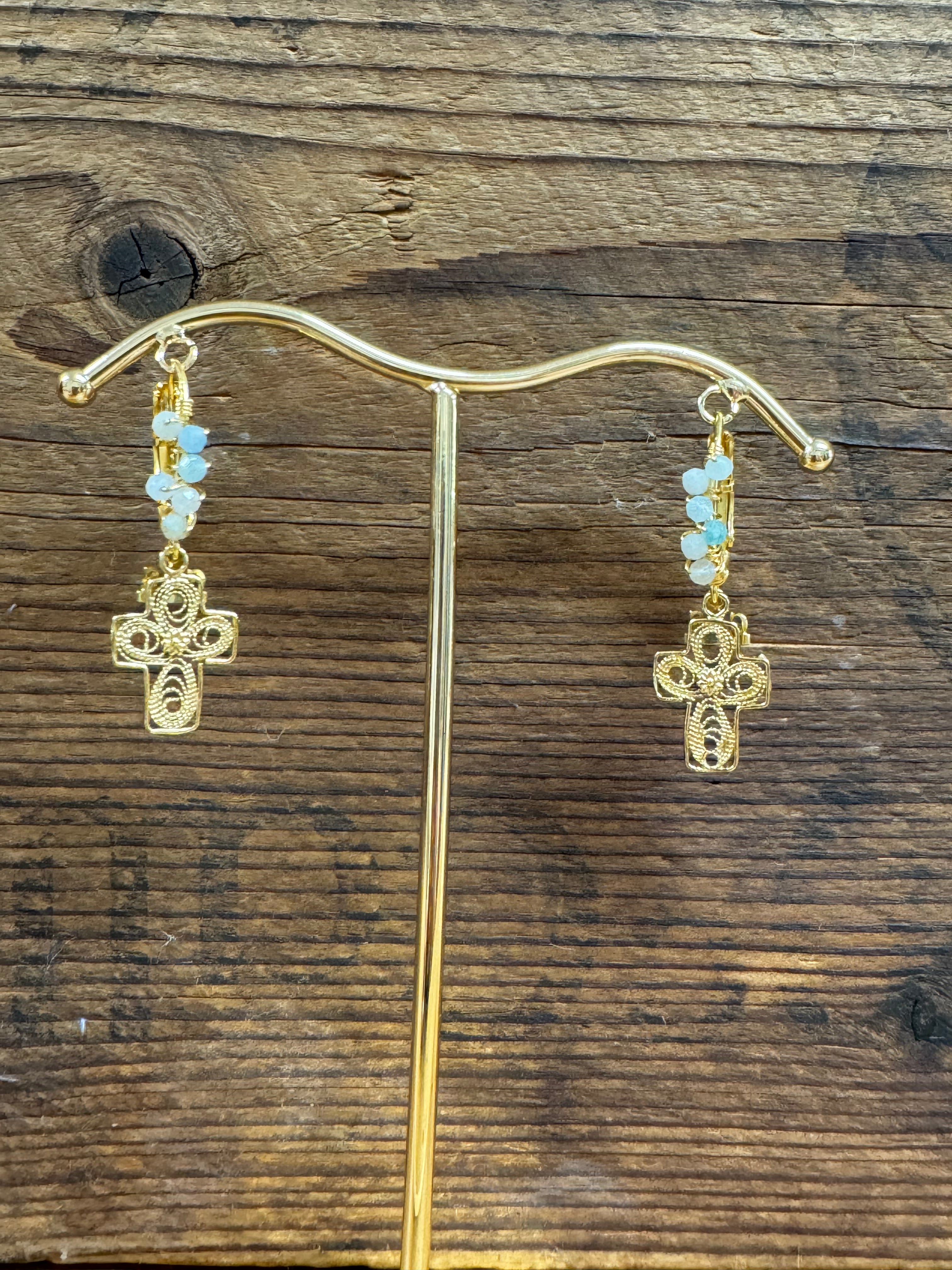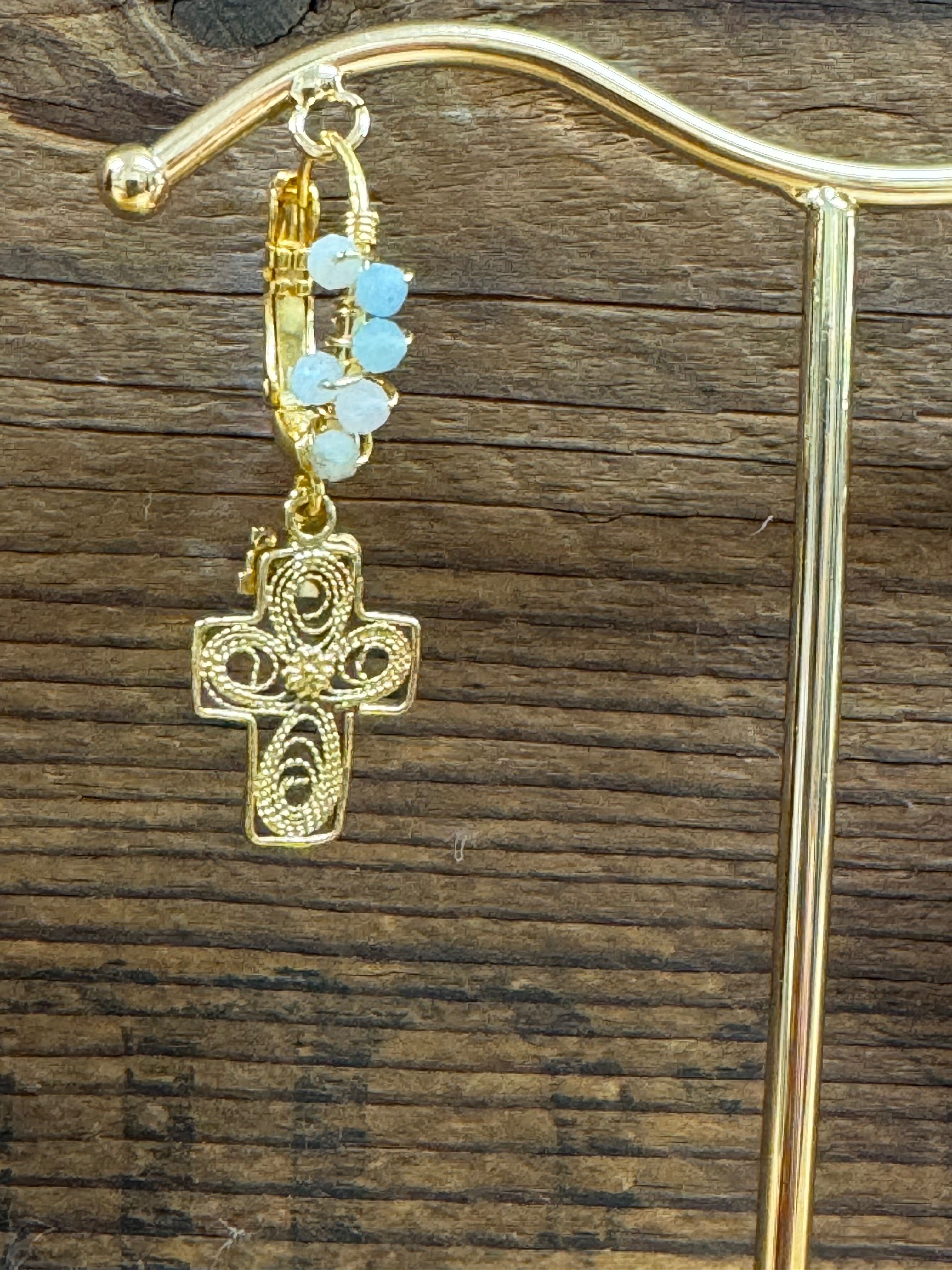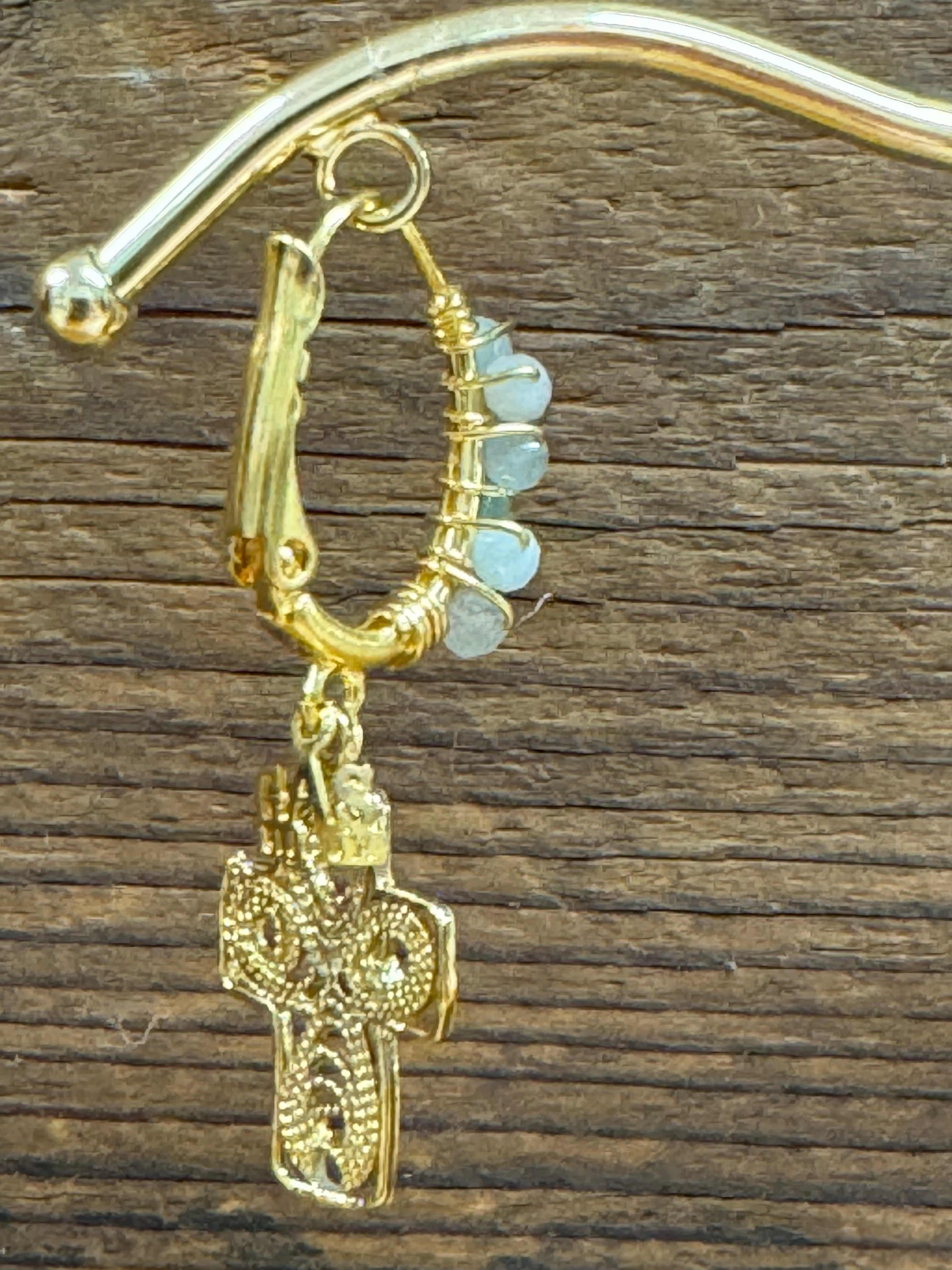 Gold-plated earrings featuring gemstones wrapped around the sleeper and a finely filigreed openwork cross.