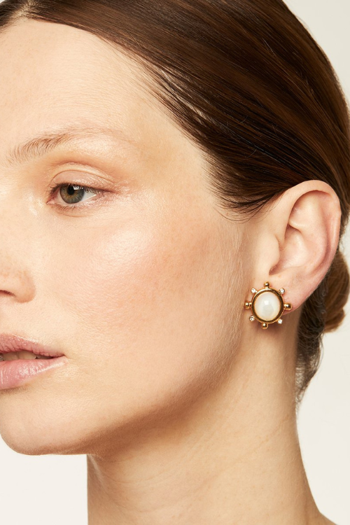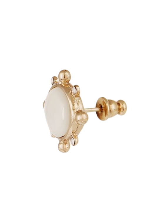 Gold plated earrings inspired by our OVO collection, adorned with an organic white Mother-of-pearl stone and sparkling rhinestones.
