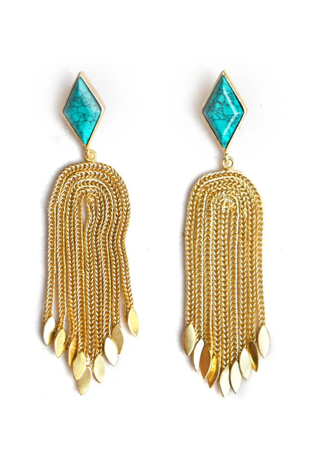 Gold luxe statement earrings. Diamond shaped turquoise set in gold border with stud back.
