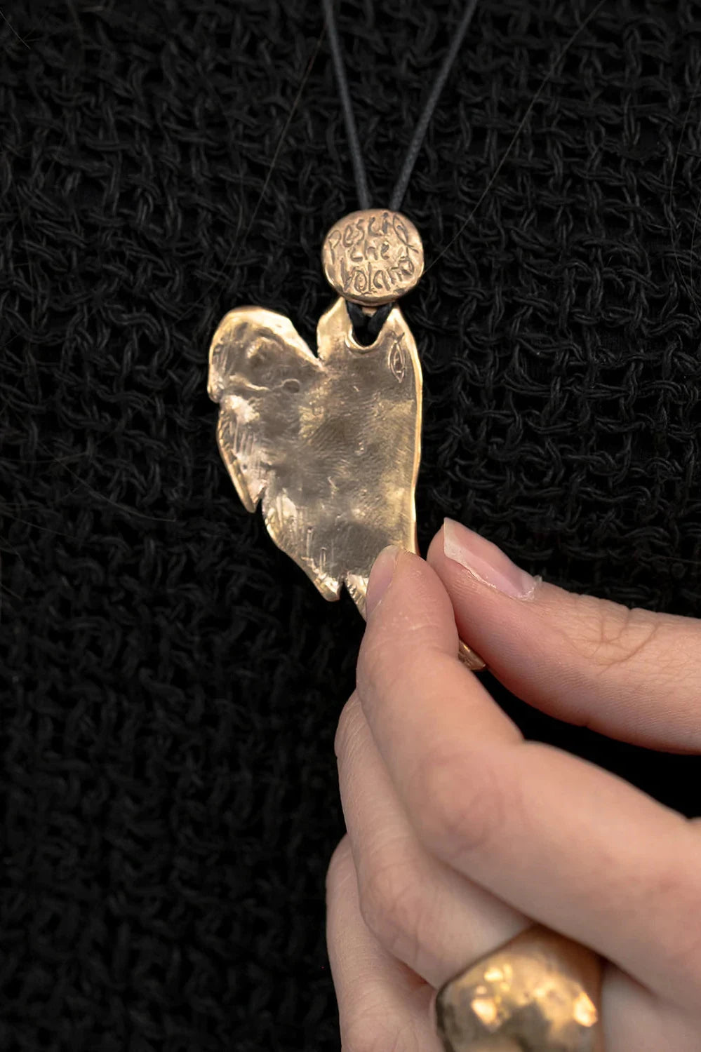 The Pesci Che Volano jewellery collection is handmade using the ancient lost-wax casting method in a small atelier in Florence, Italy. This collection of statement rings, earrings, bracelets and pendants combines bronze with materials including ebony and silver to create an ornate, yet understated style. Unique symbols are hand carved into each individual piece while irregularities and imperfections ensure no two designs are exactly the same.
