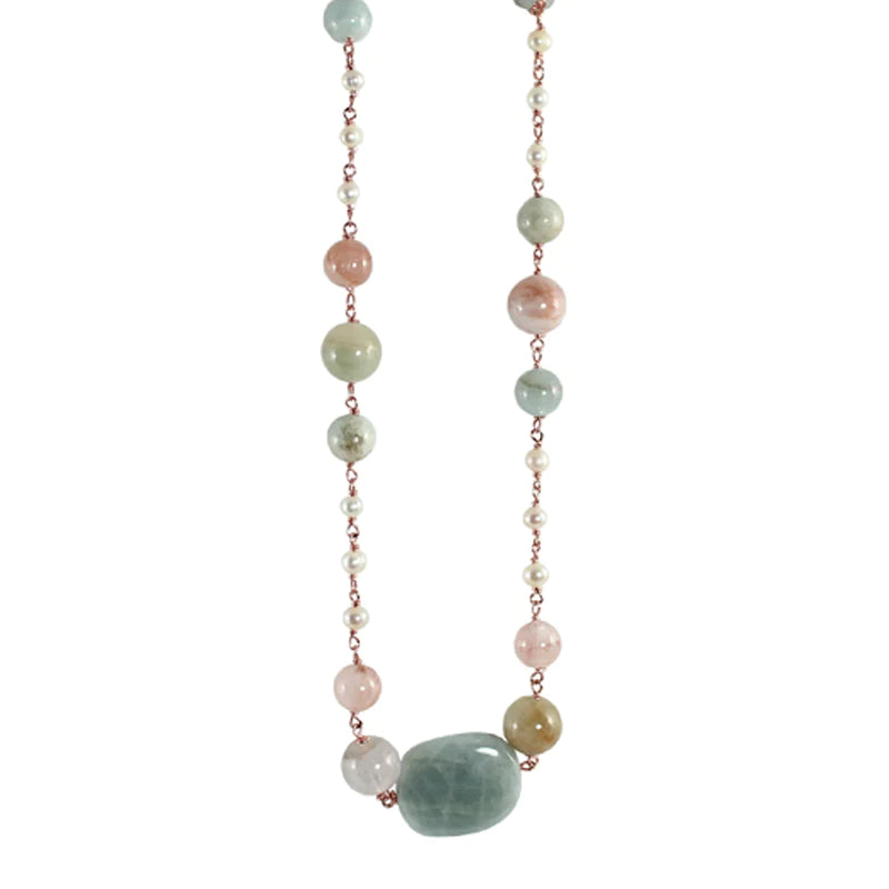 Morganite Cloudy Quartz & White Pearl Necklace - 58cm