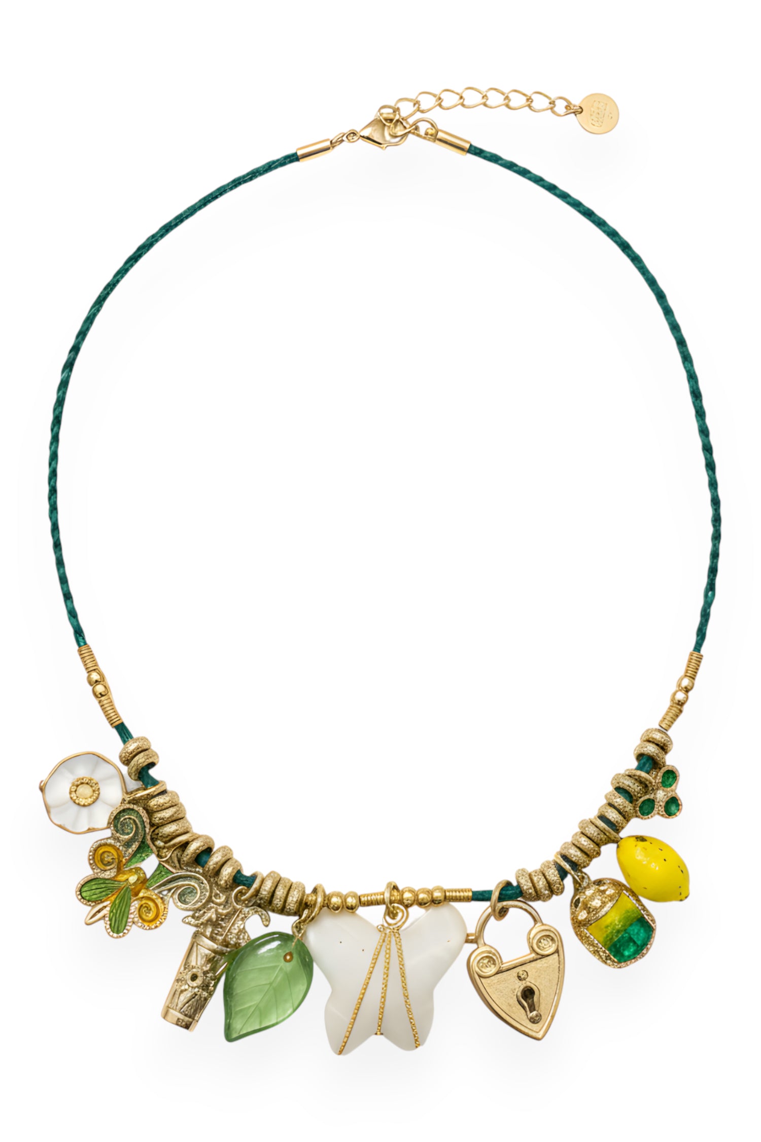A delicate gold-plated charms necklace, the Bellagio necklace features an elegant braided design in colorful raffia, enhanced with twisted threads, hammered rings, and unique charms. A protective turtle, gemstone, shell, or enameled fish each detail evokes a precious talisman. Some charms come from the André Gas archives. Handcrafted in our Maison Atelier, this piece of jewelry tells a story that continues, is passed on, and is worn.