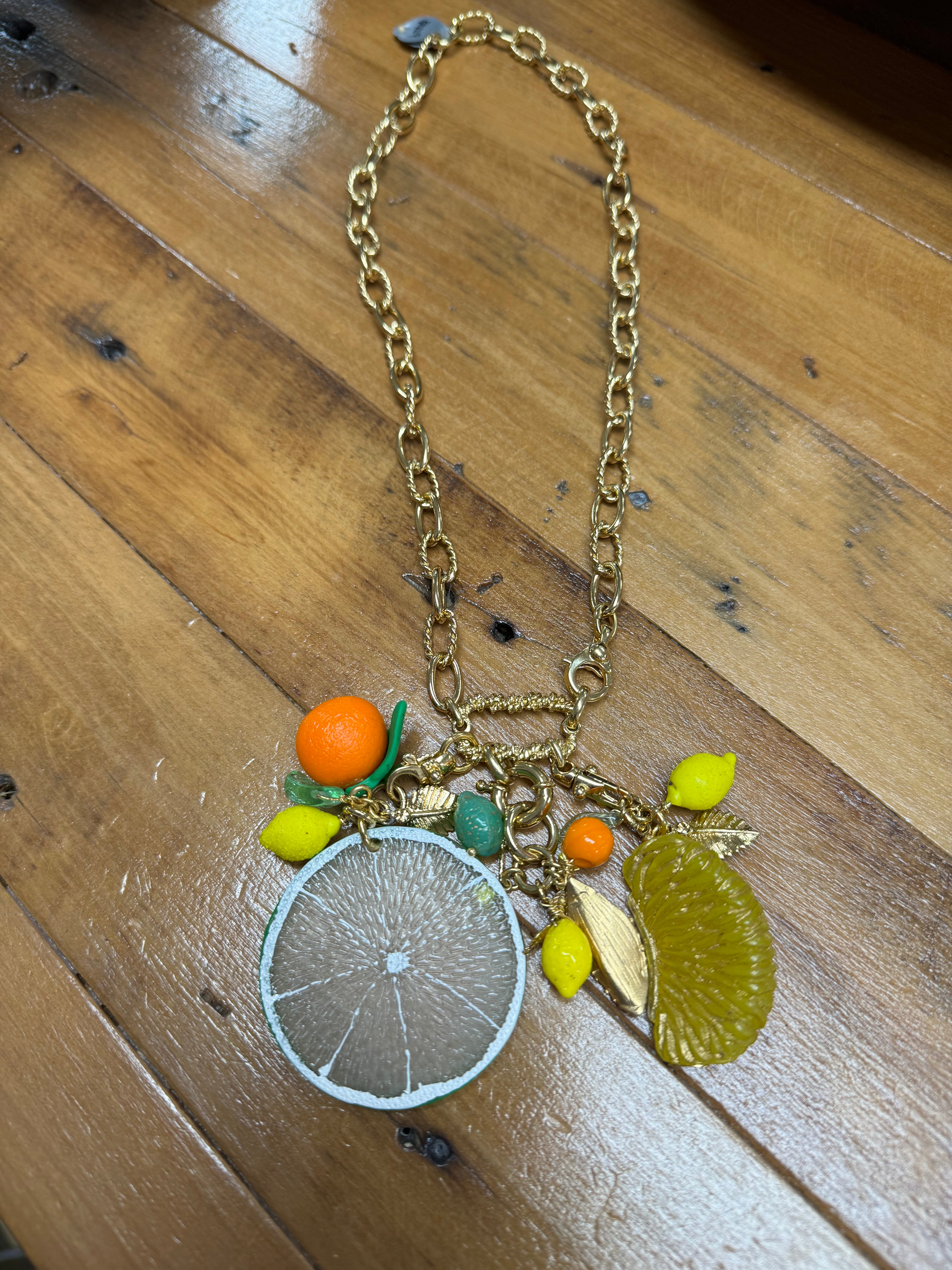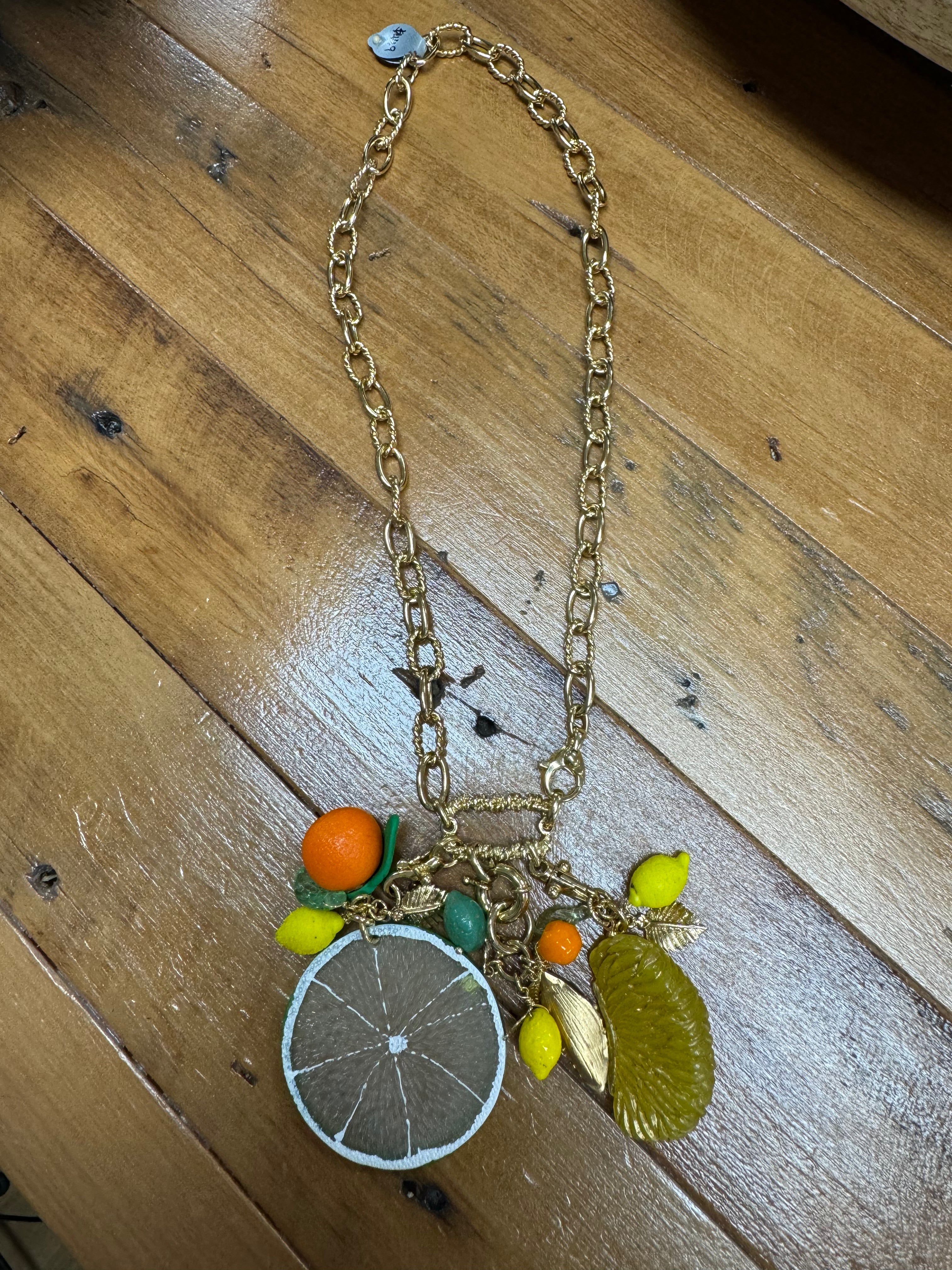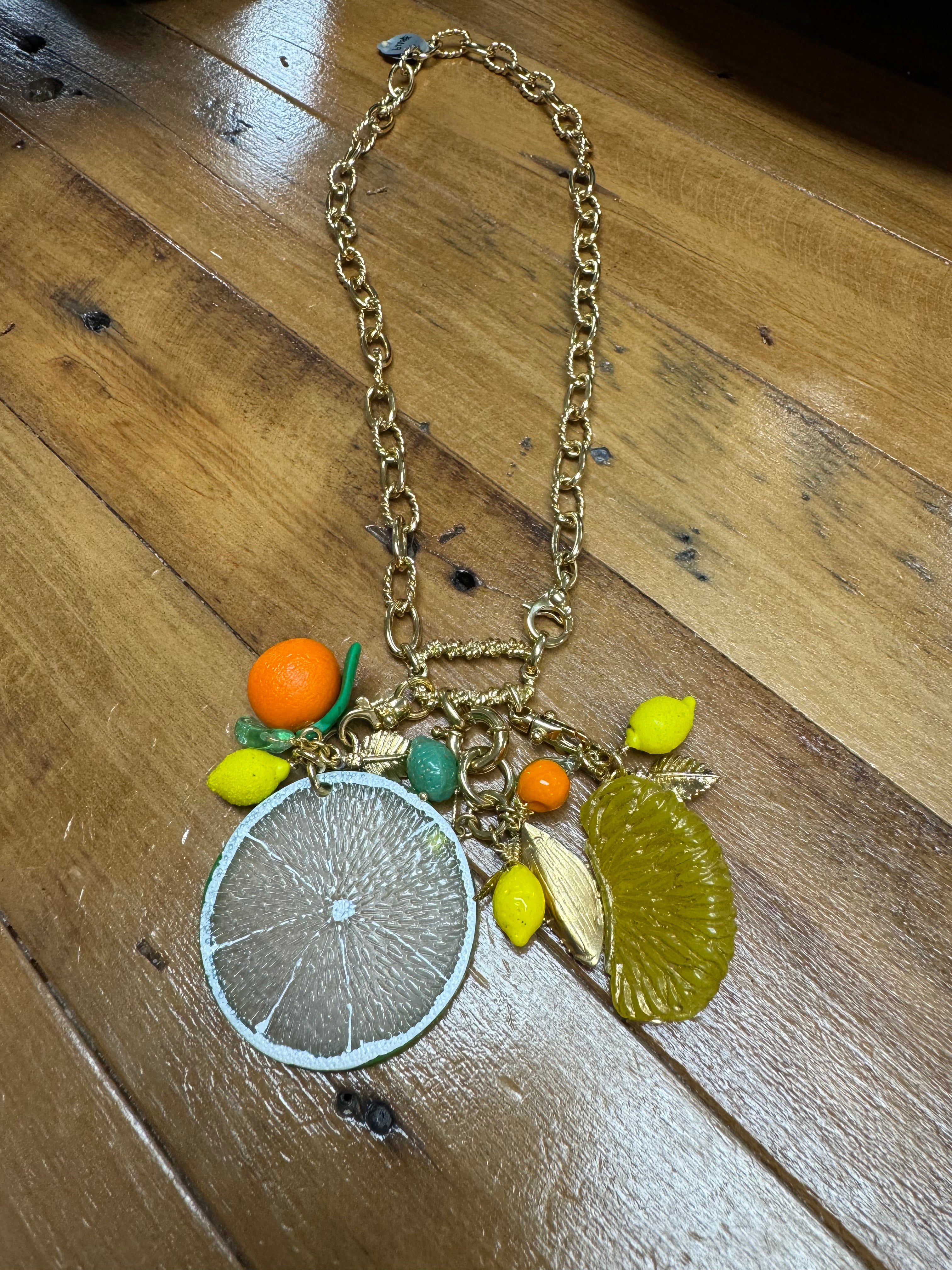 Vintage necklace composed of a gold plated chain adorned with three charms: hand-enamalled resin fruit themed charms -