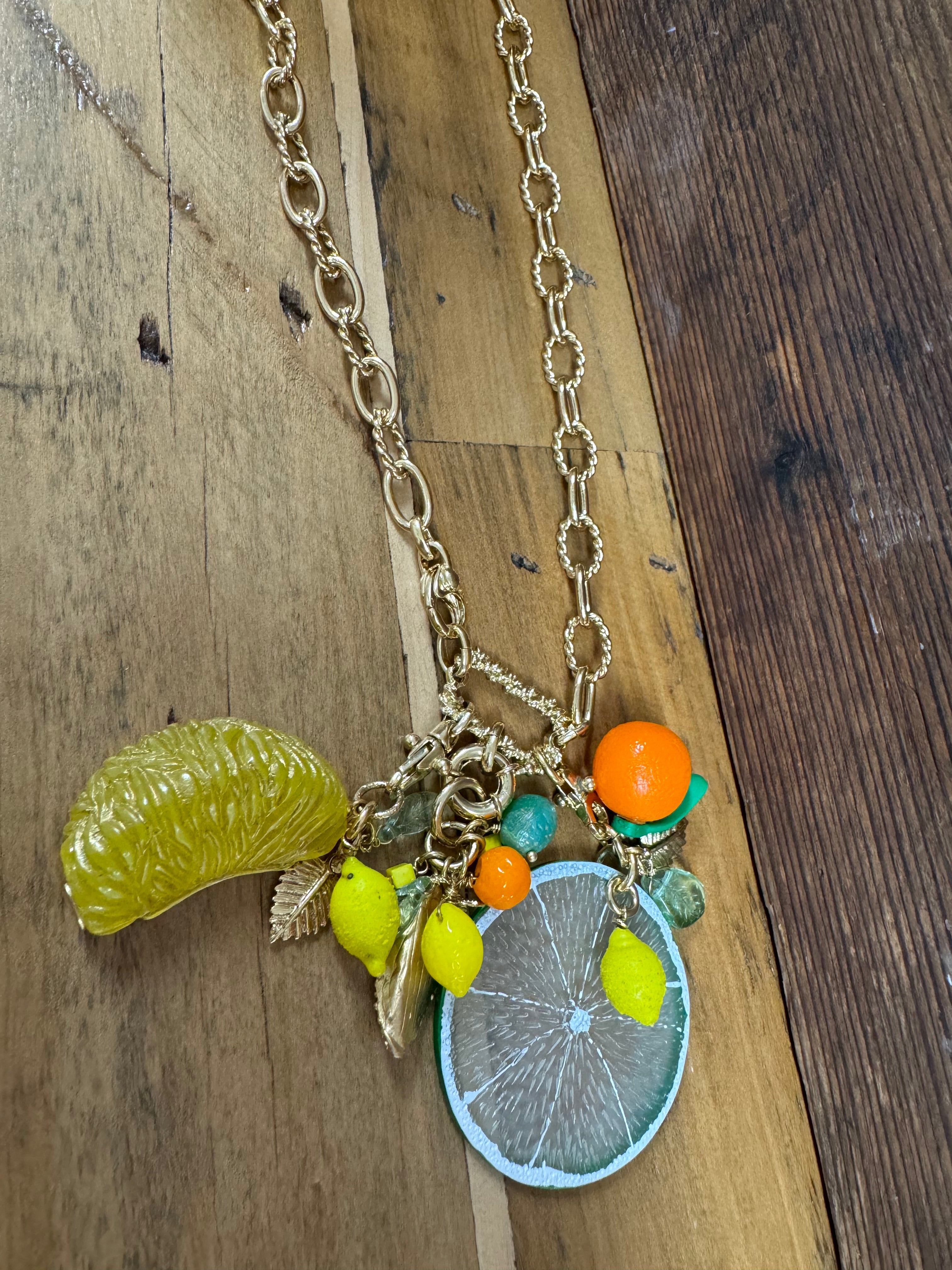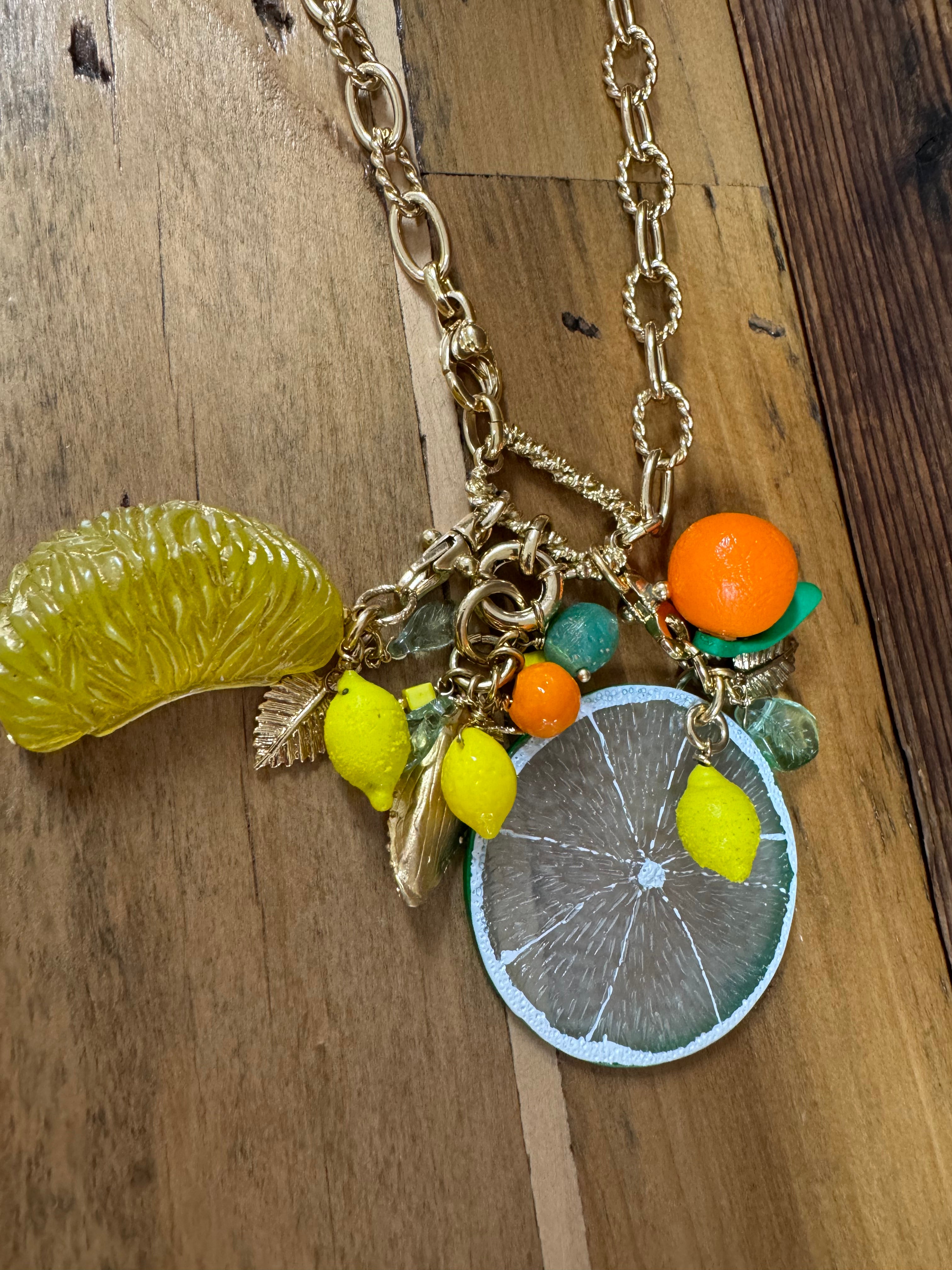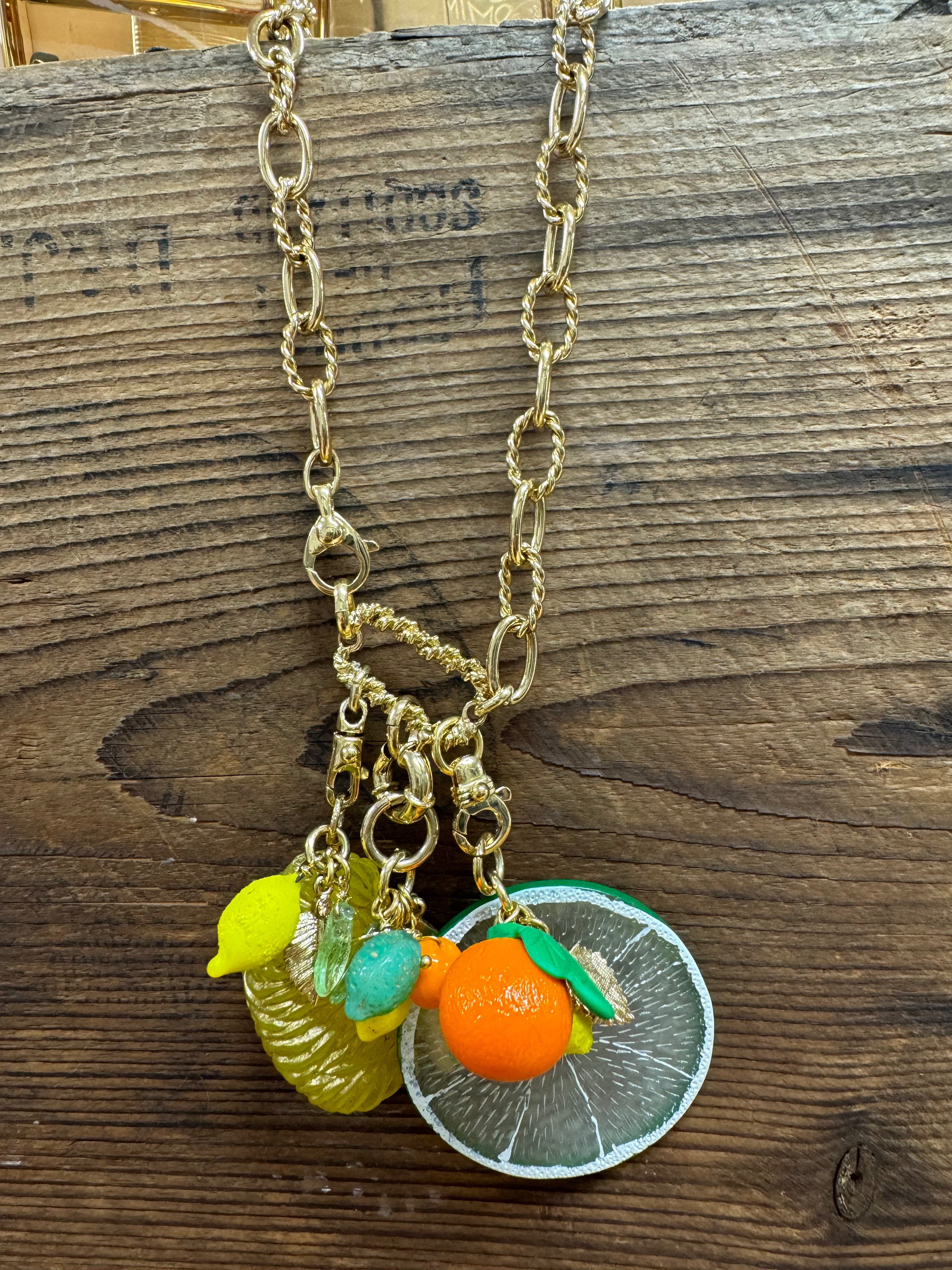 Vintage necklace composed of a gold plated chain adorned with three charms: hand-enamalled resin fruit themed charms -