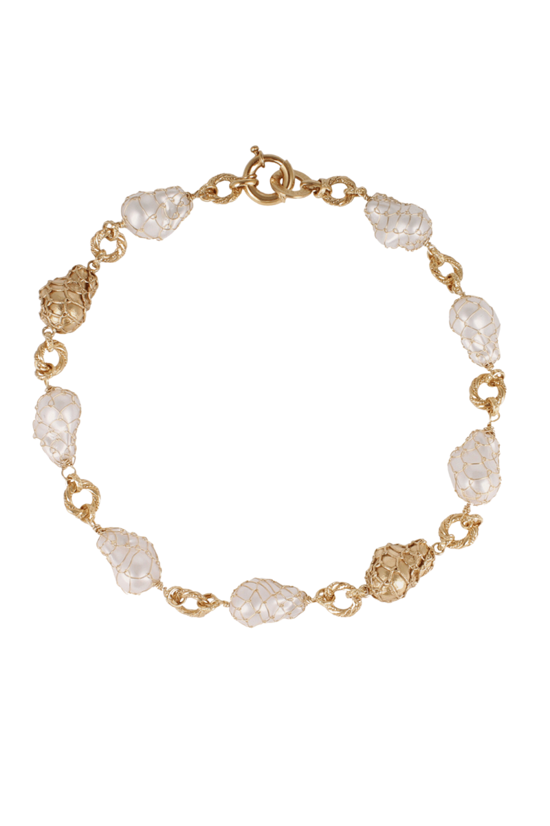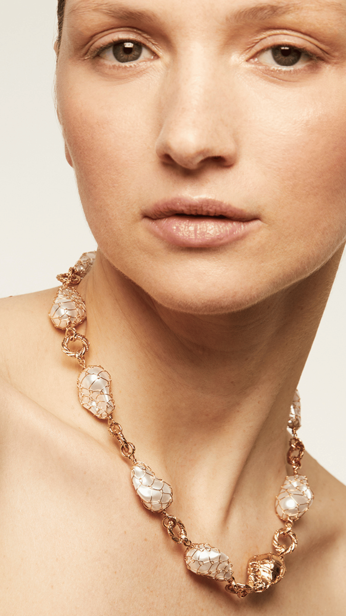 Gold-plated necklace, composed of fine rings assembled with delicate, light pearly resin beads mounted on a dormeuse, they are wrapped in a single gold-plated thread reminiscent of fishing nets. This refined model is characterized by its lightness, offering a modern, timeless aesthetic inspired by organic stones in the shape of a drop of water.