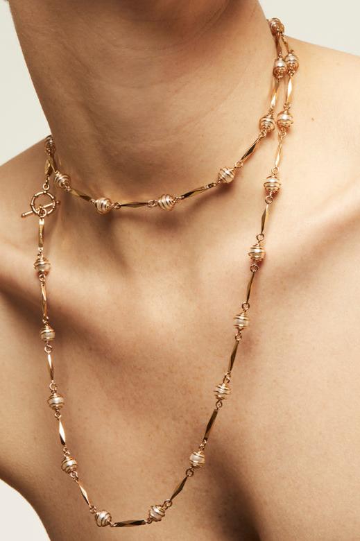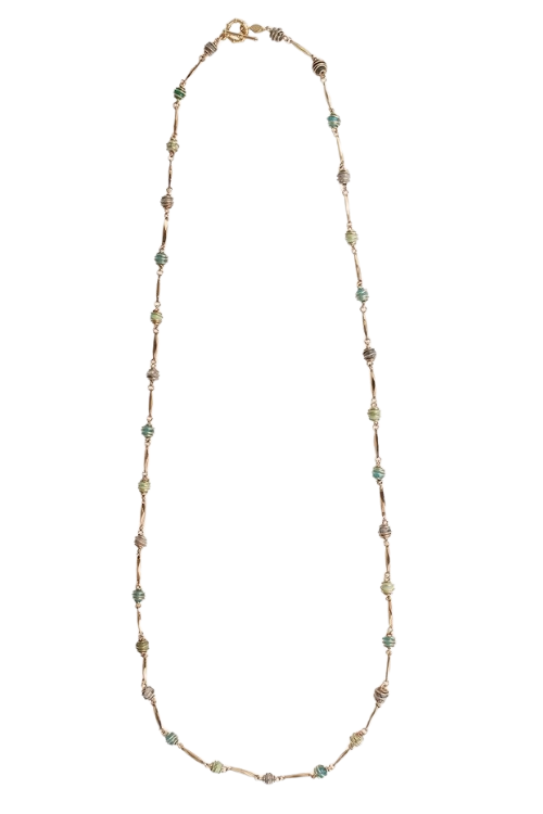 Gold plated long necklace featuring a fine chain adorned with gemstones pearls with Aventurine & Grey Agate beads, wrapped in delicate metallic threads.