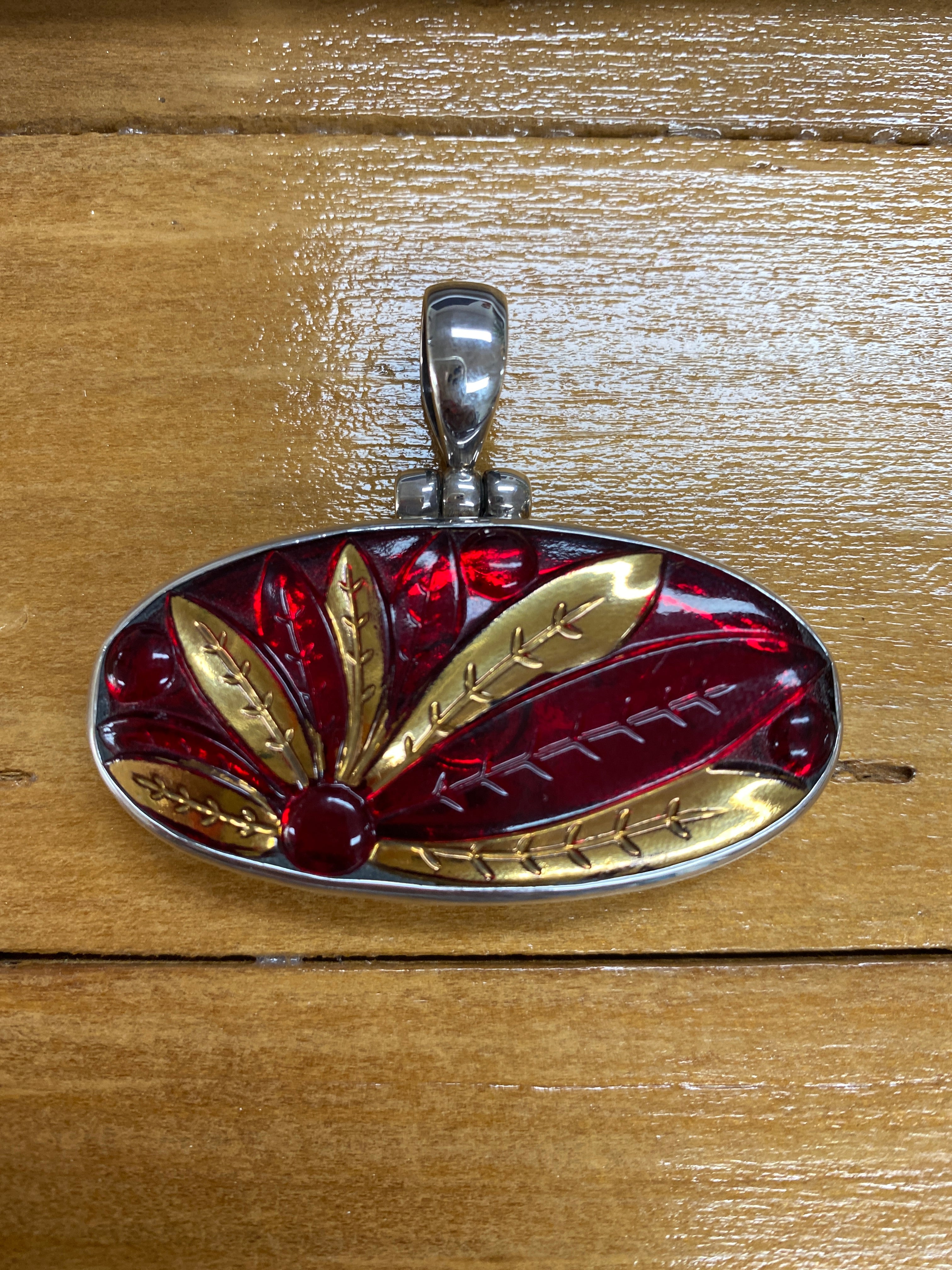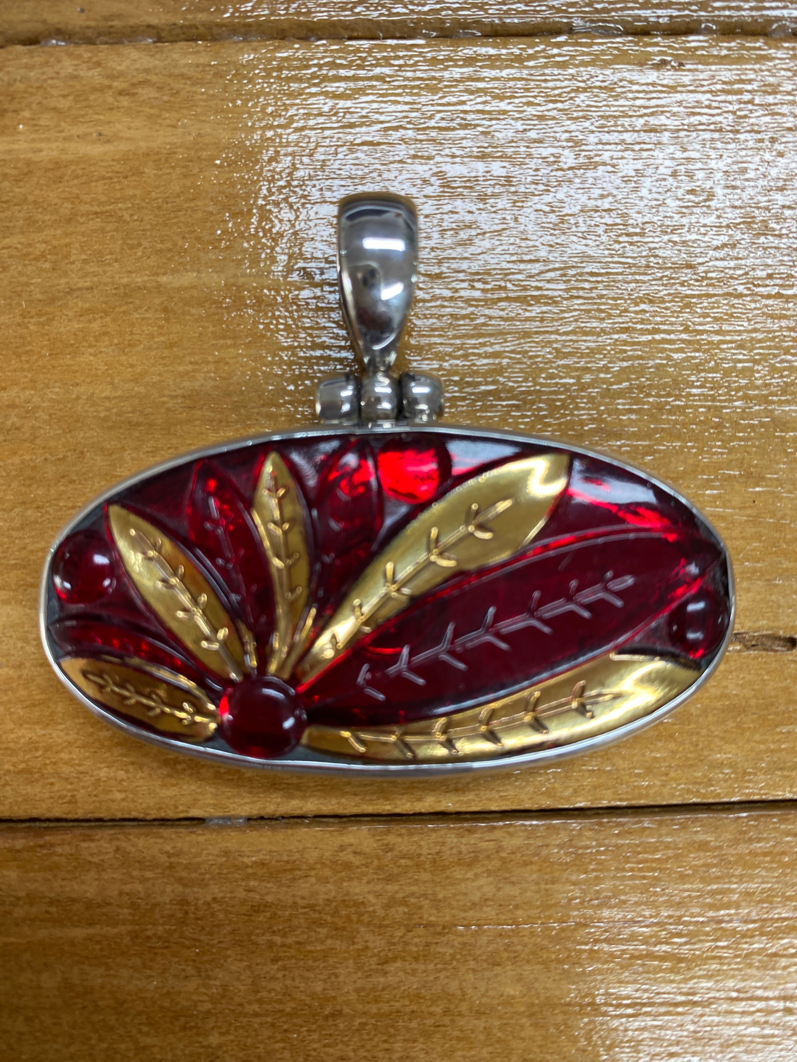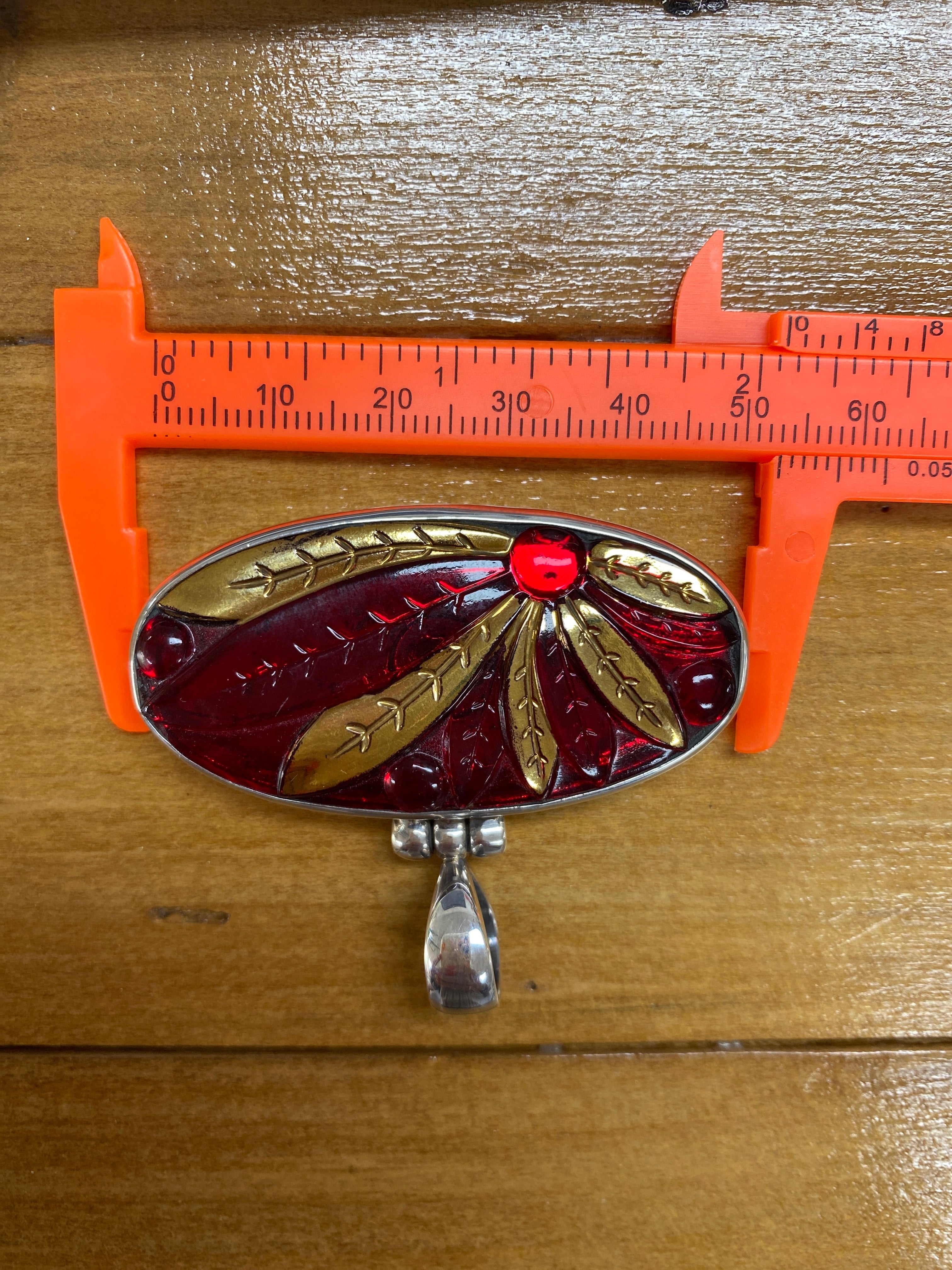 Vintage - Red & gold floral patterned 1940's Era Czechoslavakian Button set in 925 Silver
