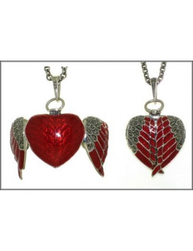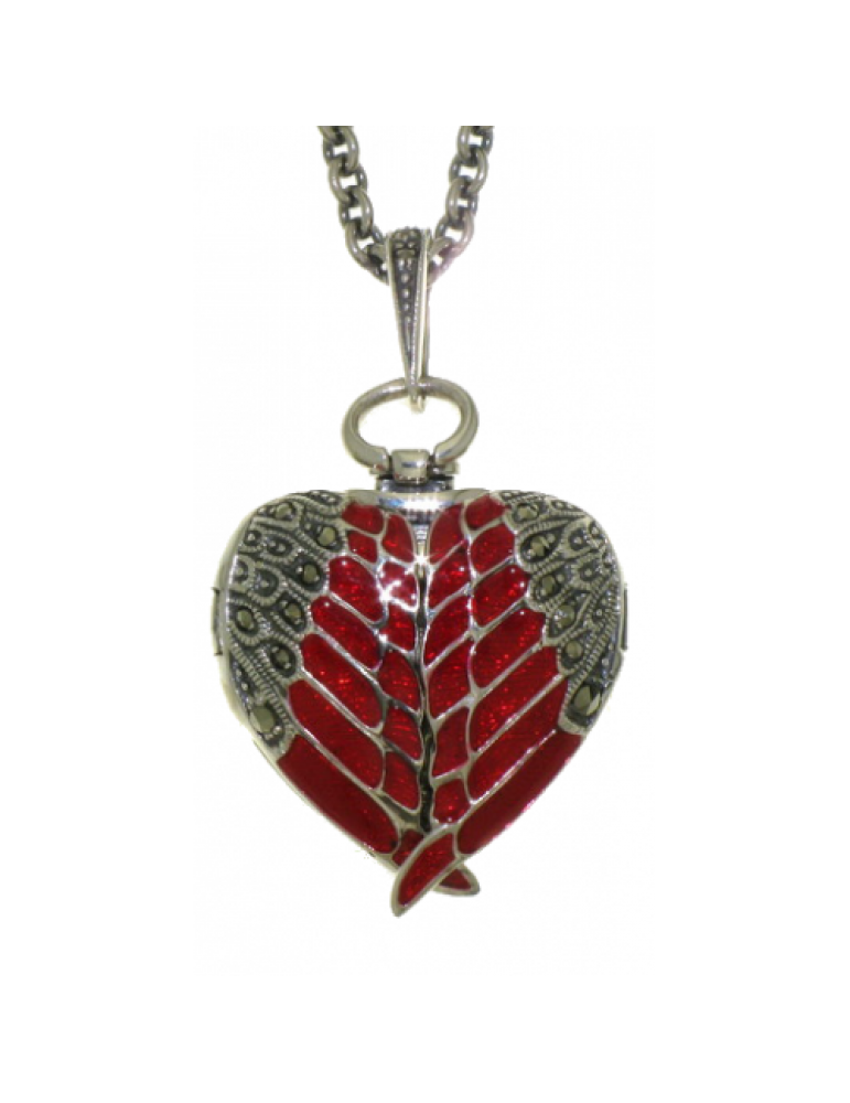 Stg silver Wing heart locket/necklet with Red enamel and hand set marcasites - locket opens. inc chain + 5cm extender. 20mm