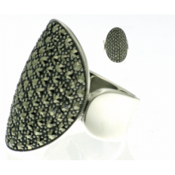 Sterling silver shield ring. Hand set with marcasite. Curves around finger. Top measures 26mm x 19mm