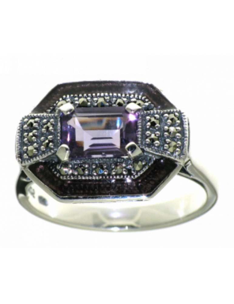 Sterling silver Art Deco style ring. Hand set with marcasite. Central 6x4mm emerald cut amethyst. Violet enamel accents. Top measures 16mm x 12mm