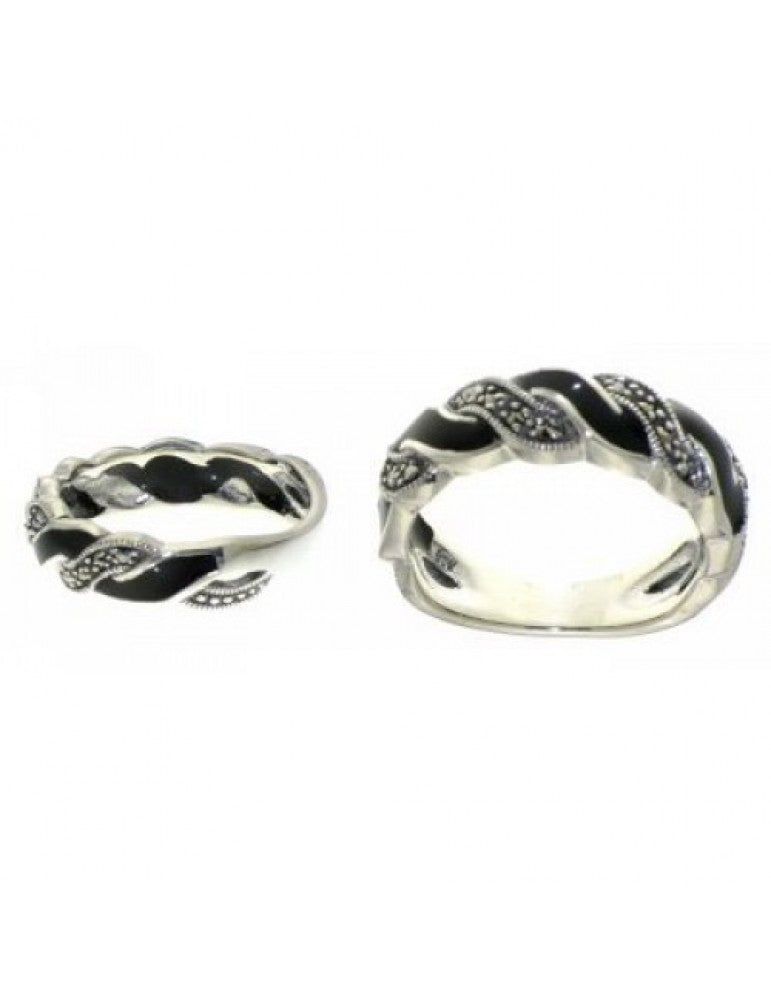 Sterling silver Twist ring. Hand set marcasite. Featuring black enamel. Width 6.5mm