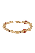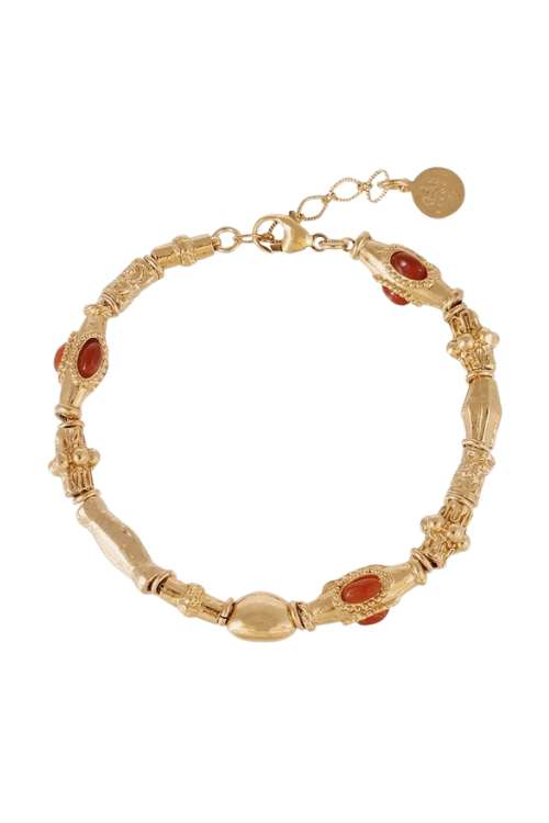 Gold plated bracelet with various pearls adorned with Carnelian gemstones cabochons. and gold plated rings in different shapes.