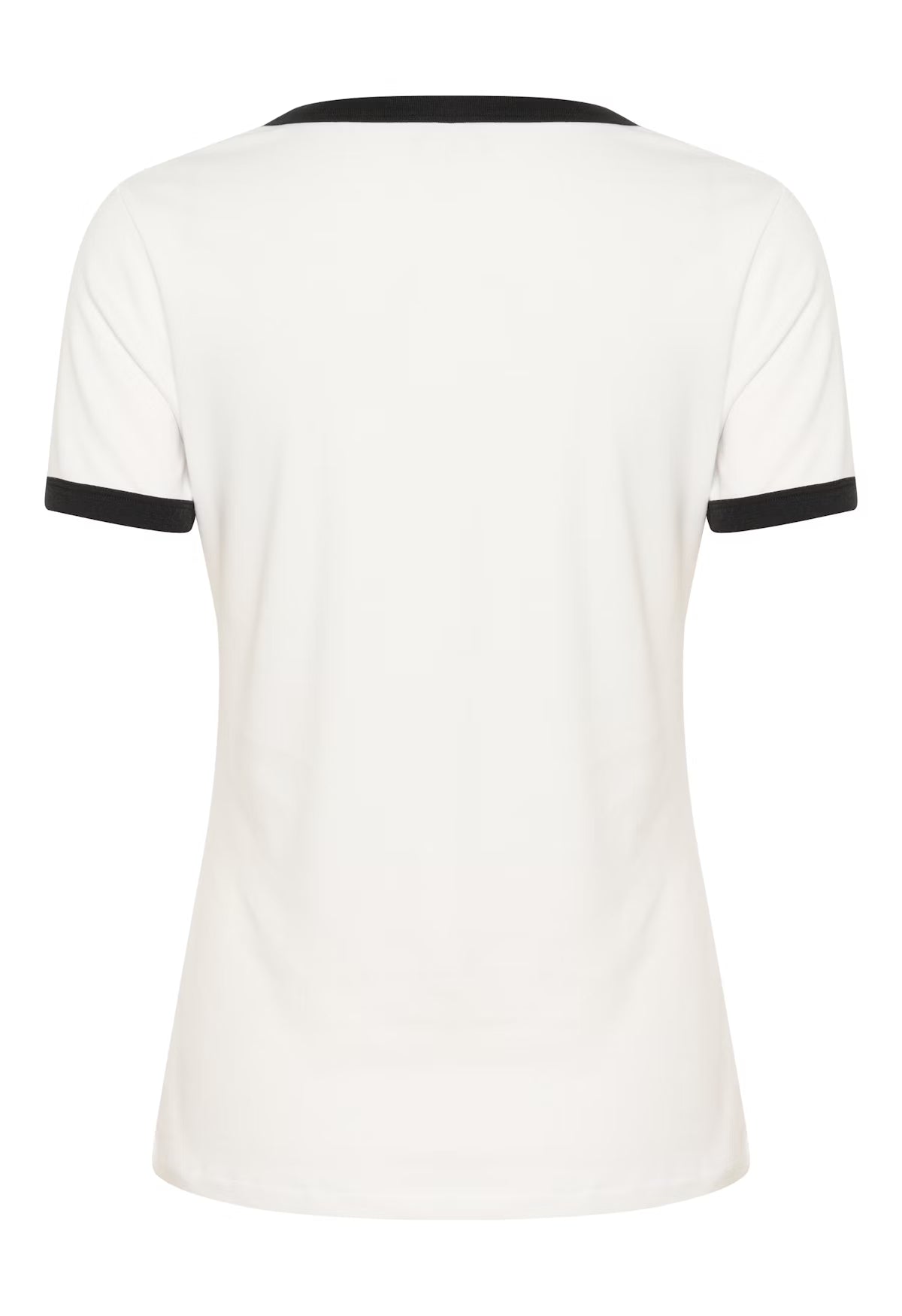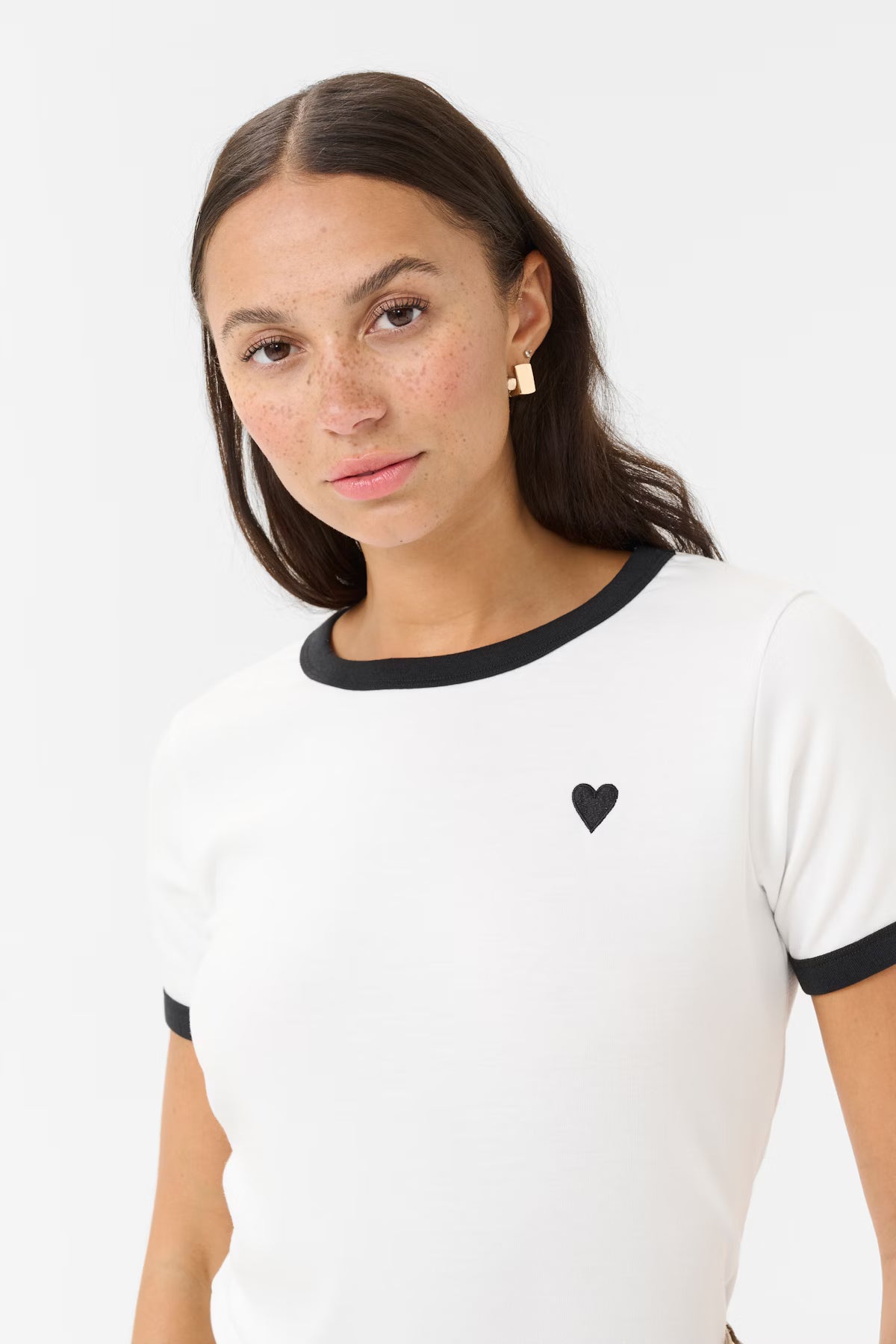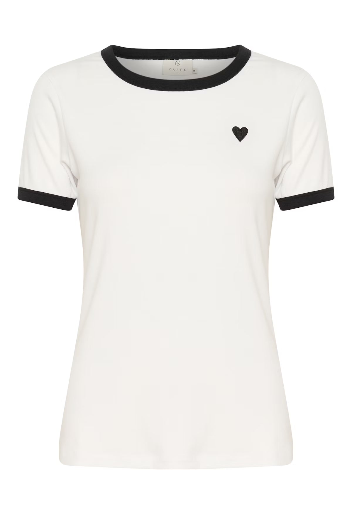 This fitted short sleeve T-shirt features bold contrast trims at the crew neckline and sleeves, highlighted by a small heart accent on the chest for a subtle graphic touch.