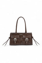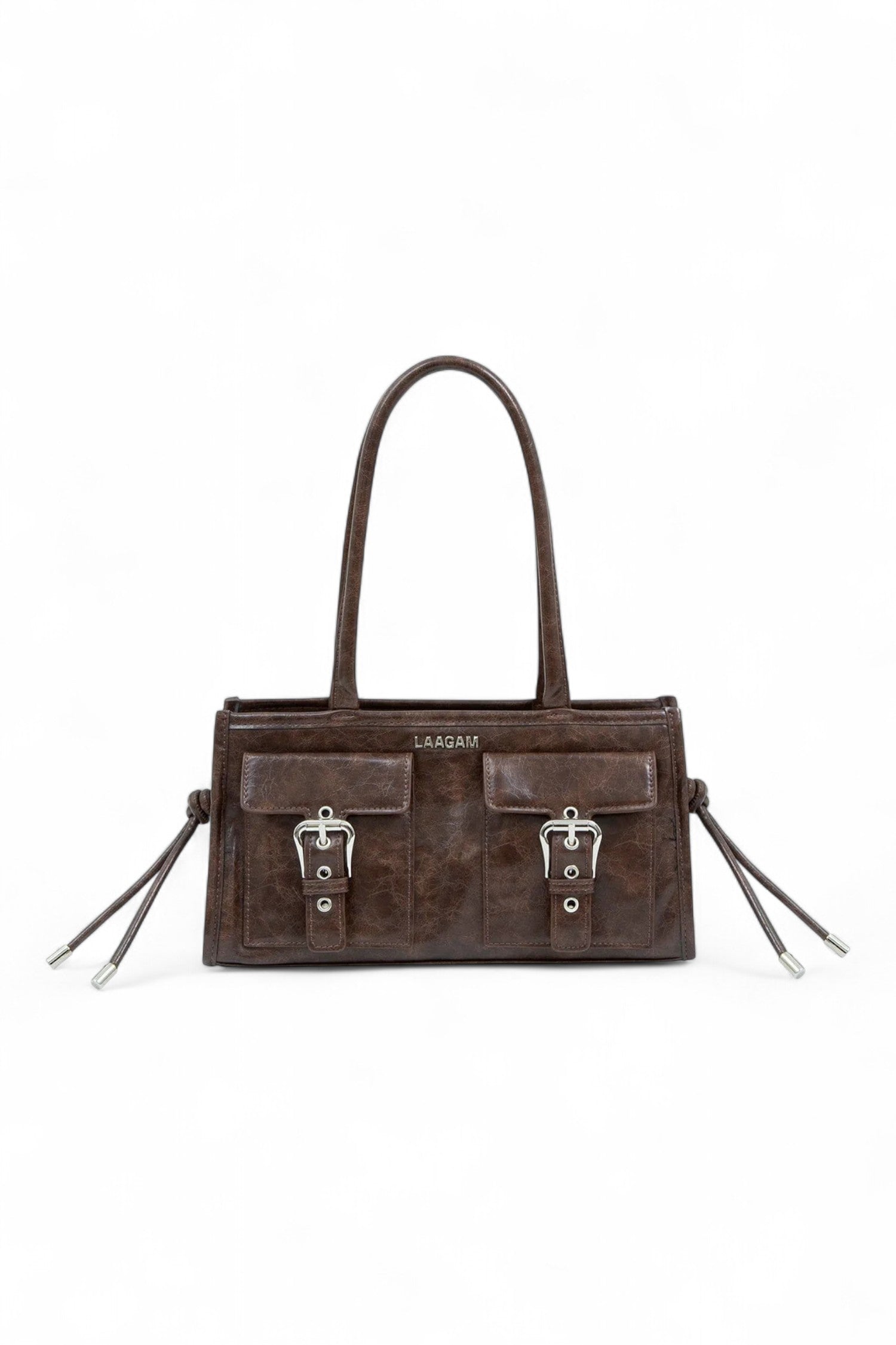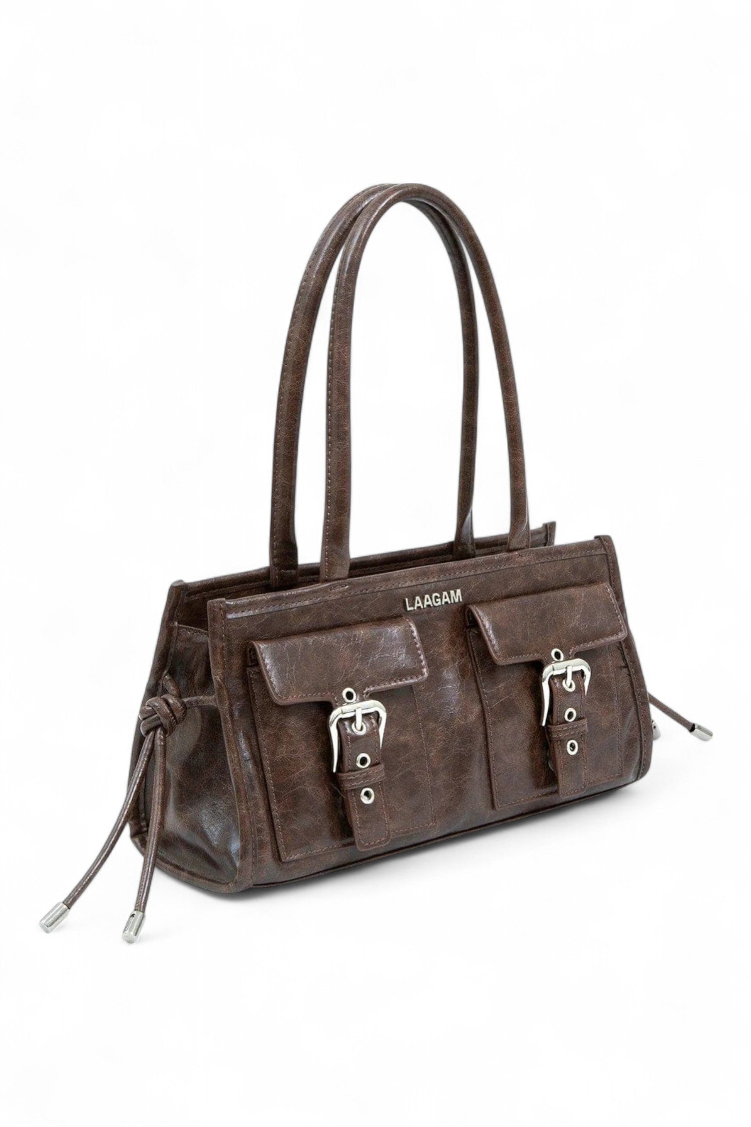 Brown multi-pocket vegan leather bag with logo detail and metal buckles on the front. Shoulder handles, metal zipper closure and interior pocket. The vegan leather used for this style has texture and shine.