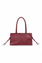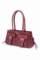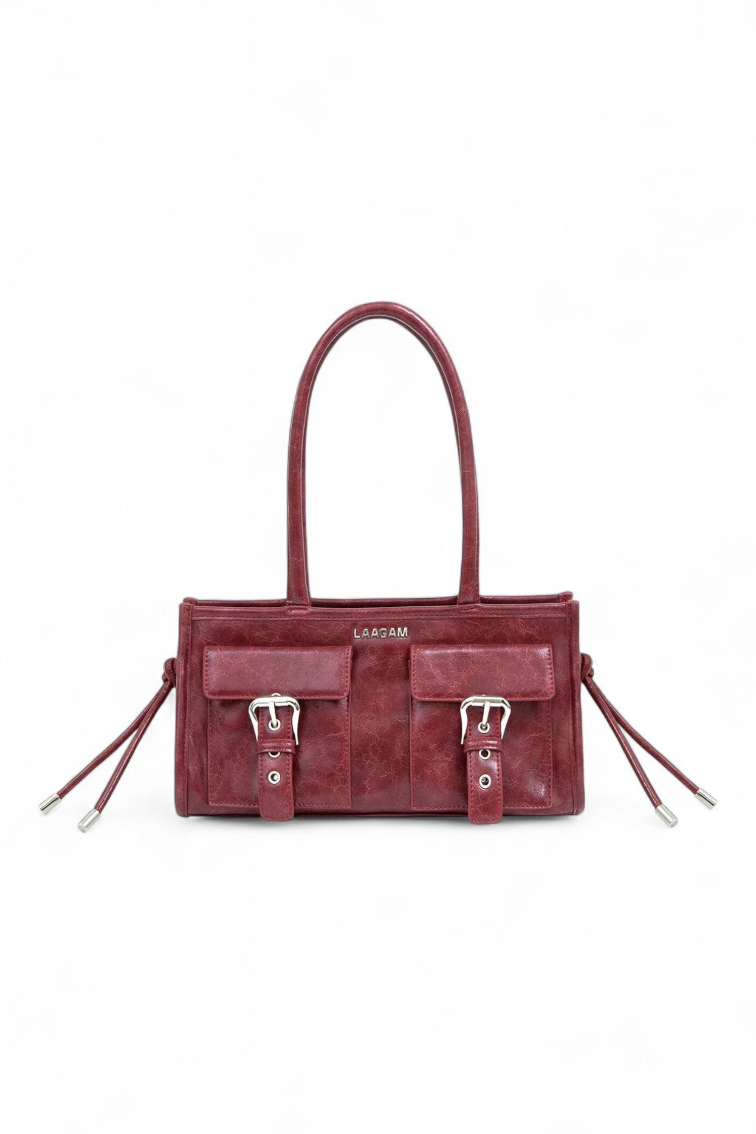 Burgundy multi-pocket vegan leather bag with logo detail and metal buckles on the front. Shoulder handles, metal zipper closure and interior pocket. The vegan leather used for this style has texture and shine.