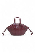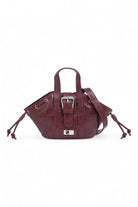 Mini rounded vegan leather bag with metal buckle detail and magnetic closure. Short handles and multi-position shoulder strap. The vegan leather used for this style has a worn look.