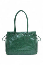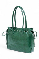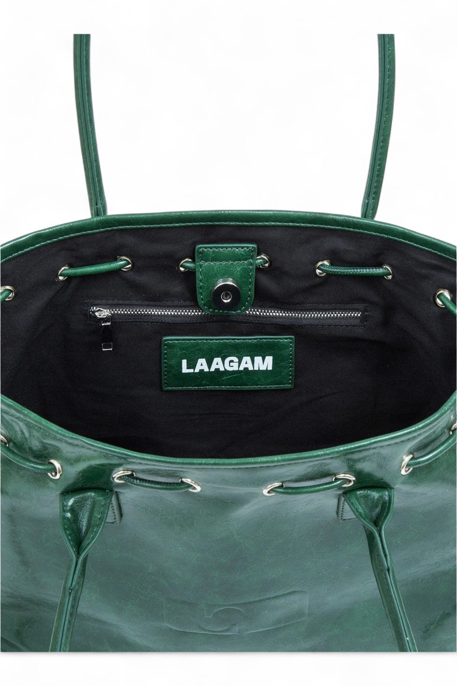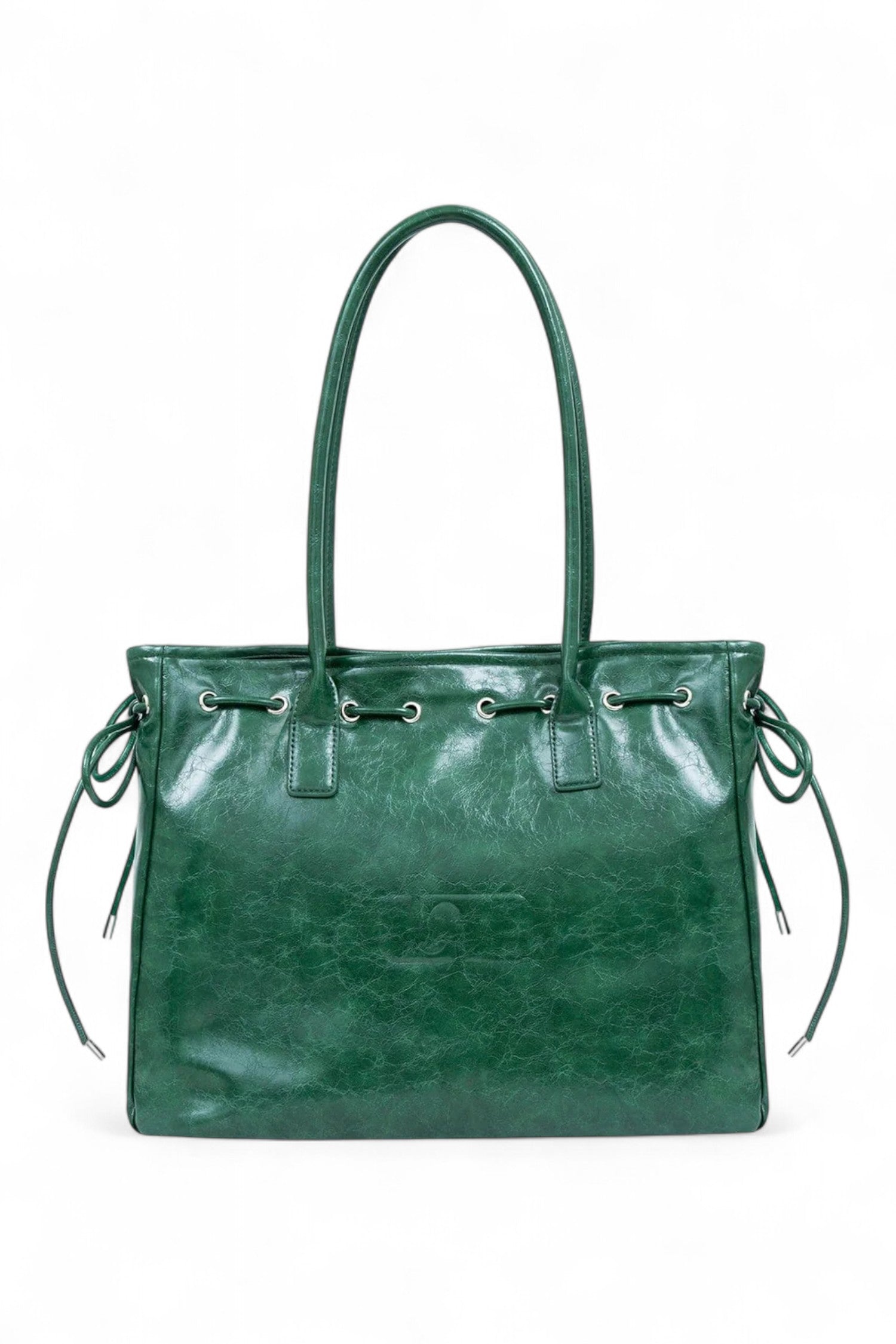 Vegan leather shopper bag with embossed logo detail on the front. Shoulder handles, magnetic closure and interior zipper pocket. This model fits an 18" laptop. The vegan leather used for this style has a worn look.