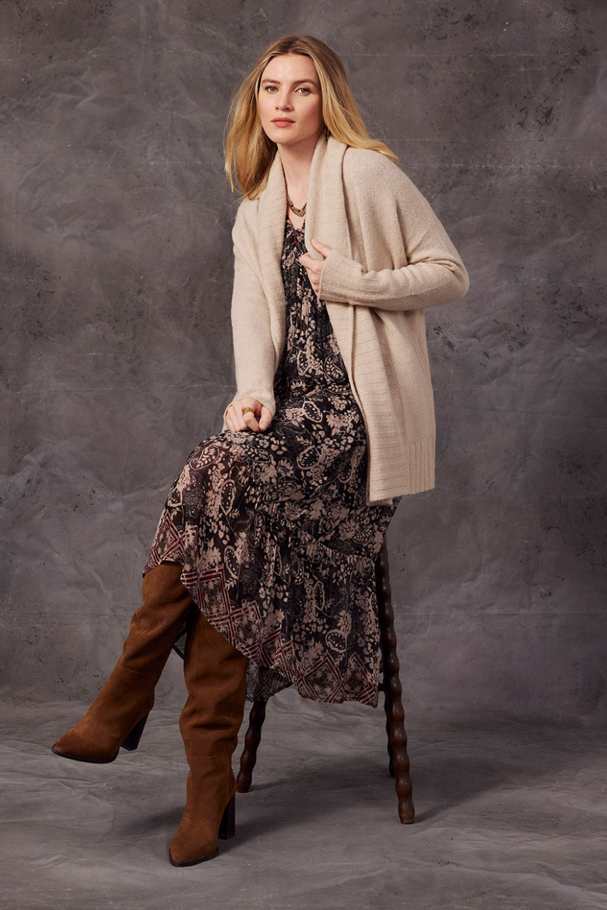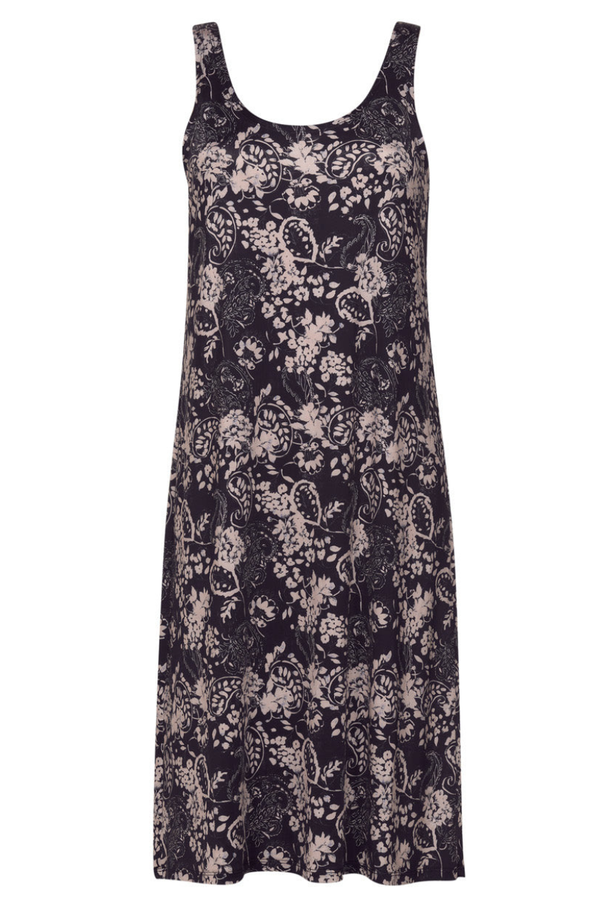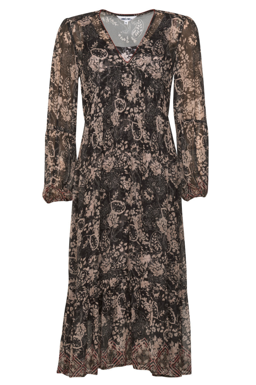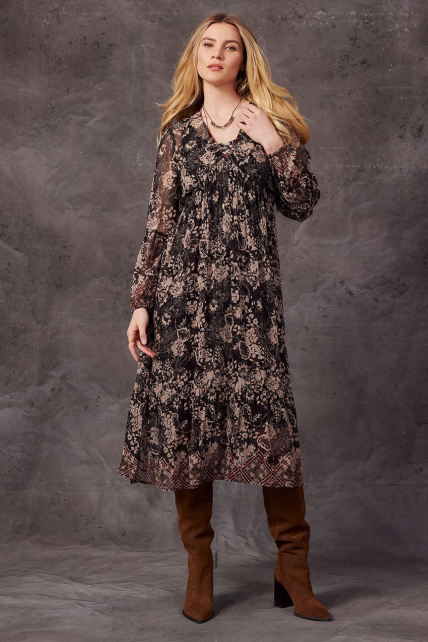 Sheer V-neck midi dress with contrast stitch detailing around the neckline. Featuring a border print on the lower sleeve and hem panel. Includes a matching A-line slip.