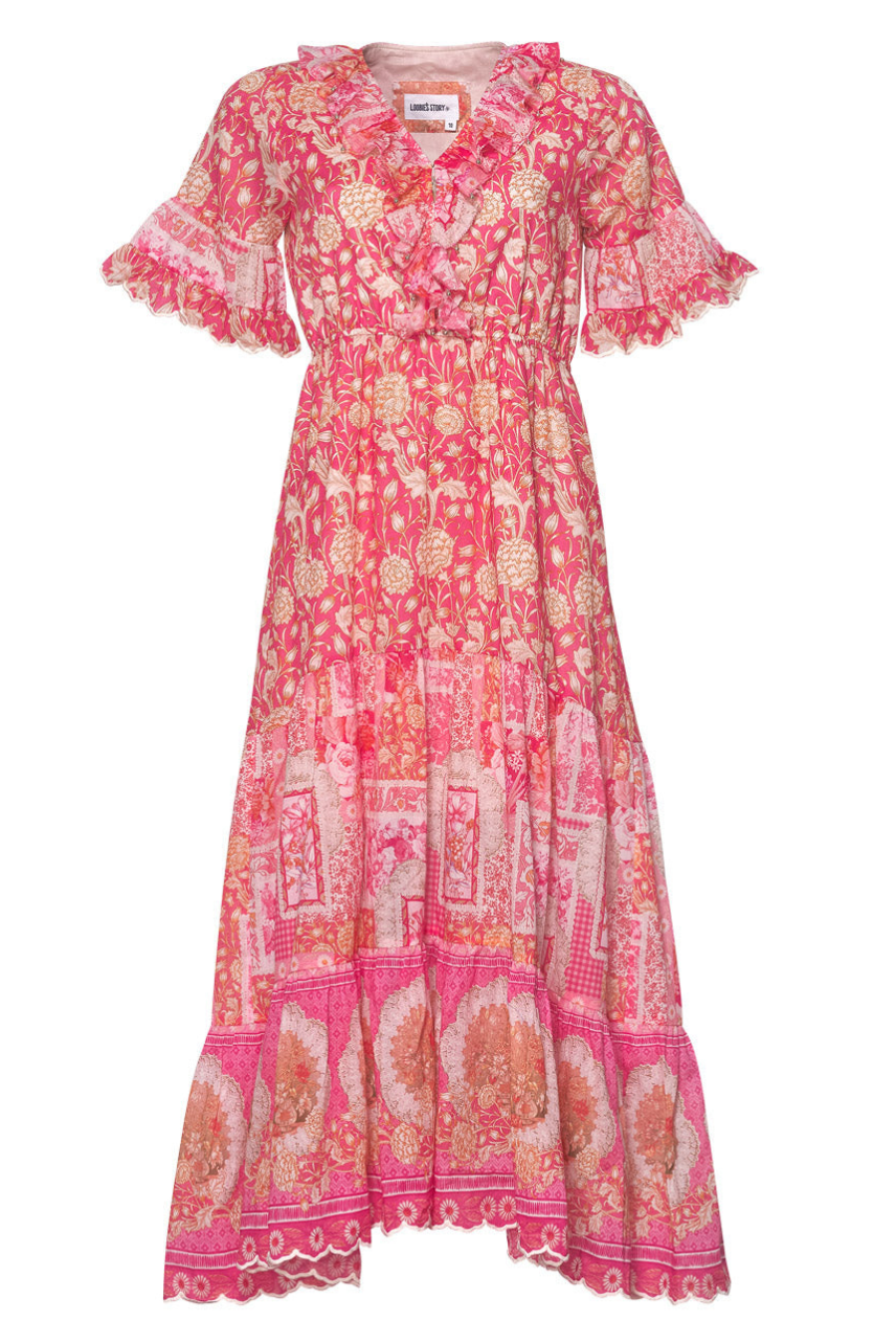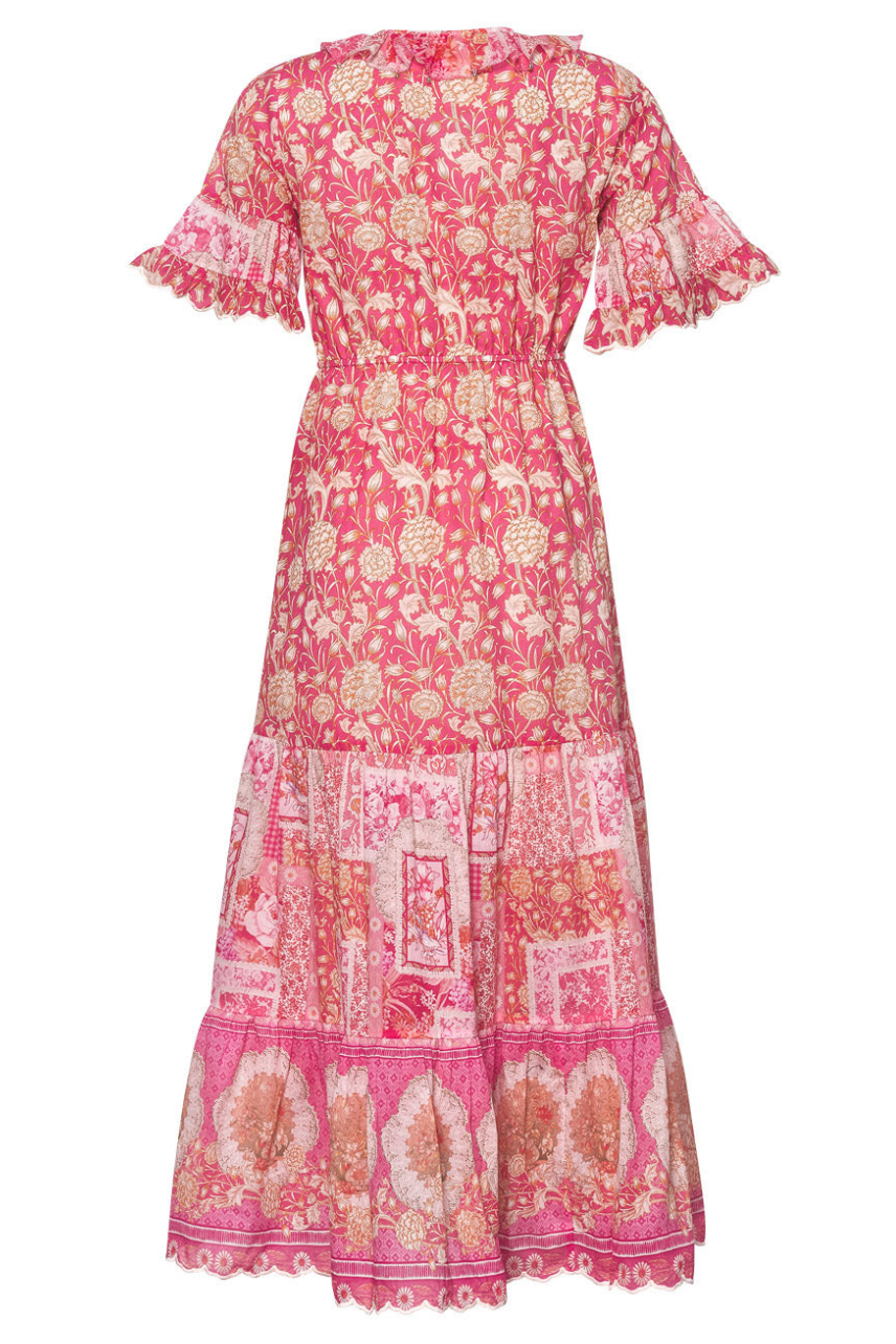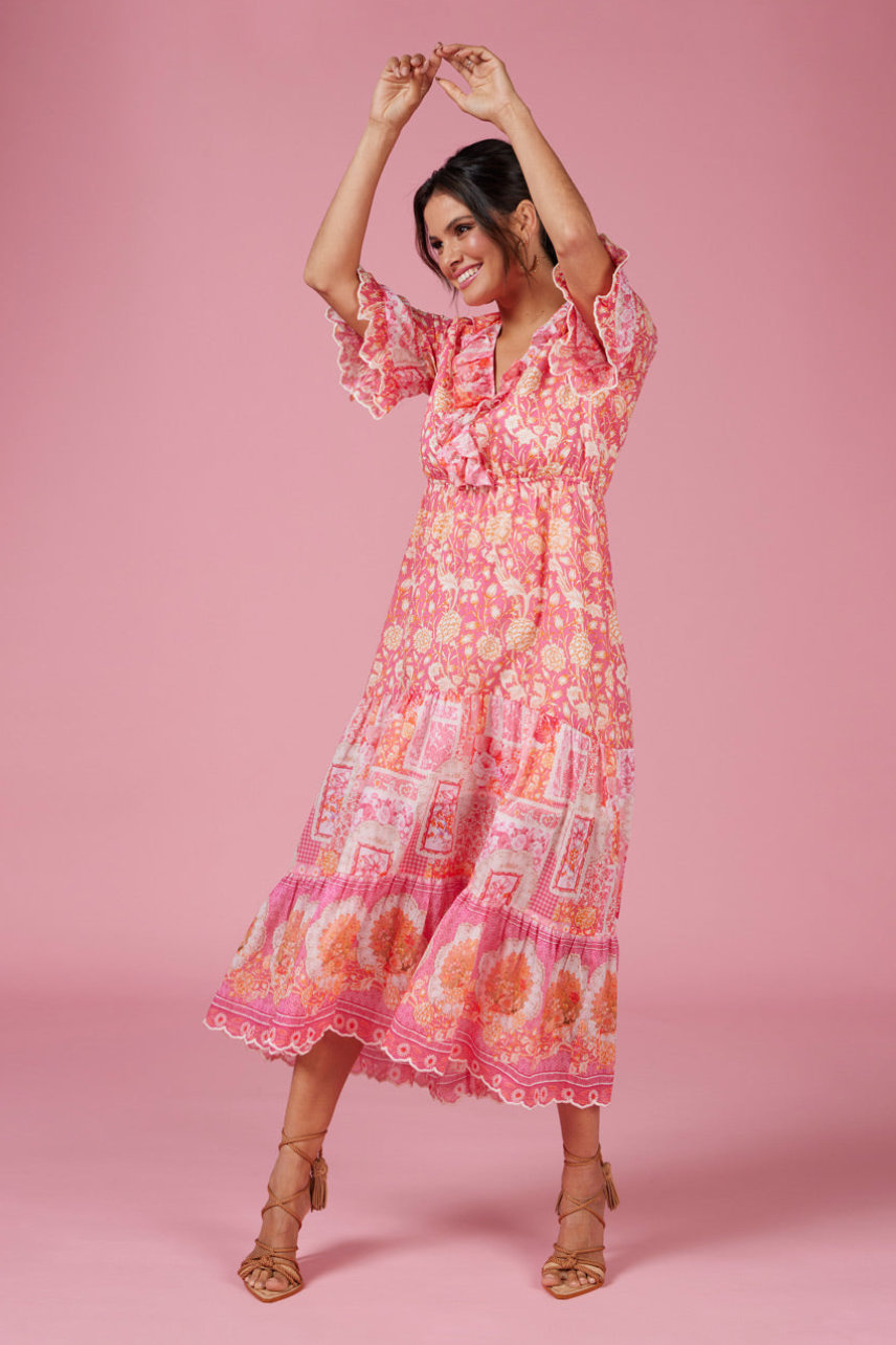 Show stopping tiered midi dress with a flounced neckline, both trimmed with metallic beading. Featuring an intricate boarder print in the hem panel with scalloped embroidery trim detail around sleeve edges and at hem. Fully lined.