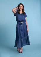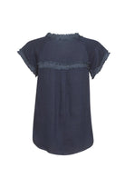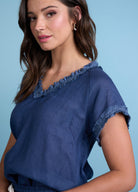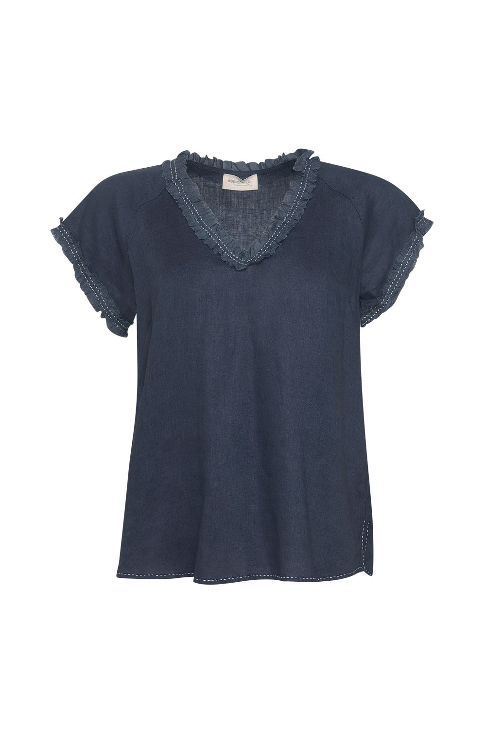 Relaxed fit linen tee, with pigment dyed ruffles around neckline, and sleeve hems, featuring embroidery top stitching across ruffles.
