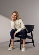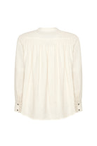 Button-up shirt in a bonded cotton, featuring raw-edged ruffle detail, and a shirred back yoke, with button-up cuffs and a rounded hem.
