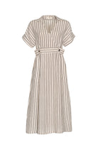 Midi dress with a V-neckline with faux wrap bodice, fold-up cuffs and in-seam pockets. Partially elasticised band with buttoned tabs.