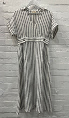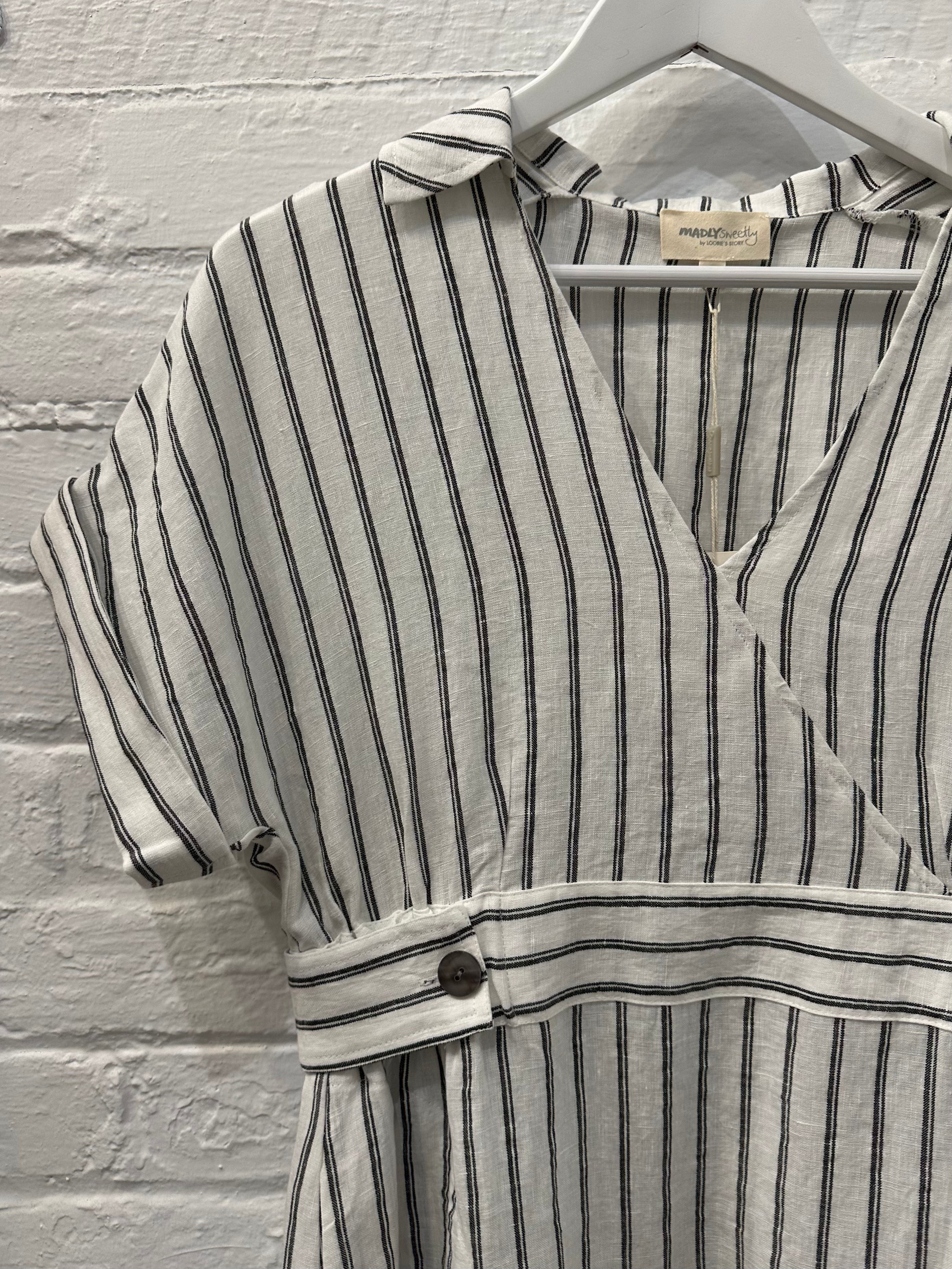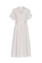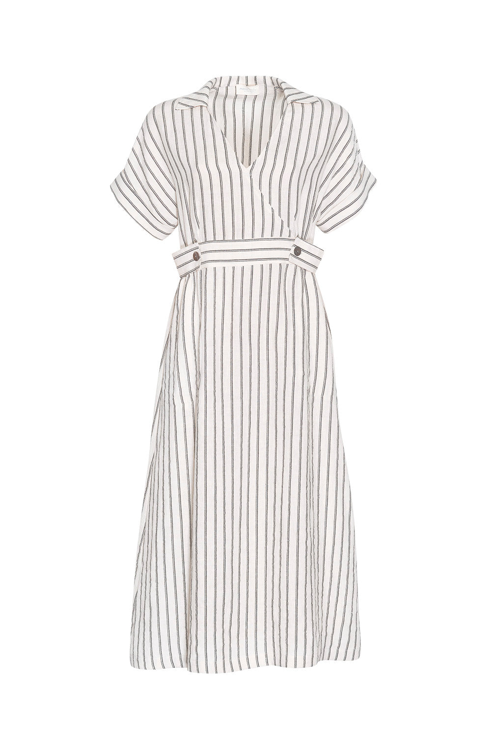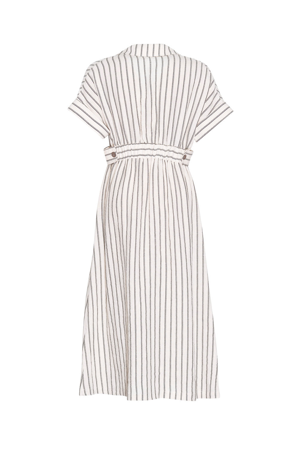 Midi dress with a V-neckline with faux wrap bodice, fold-up cuffs and in-seam pockets. Partially elasticised band with buttoned tabs.