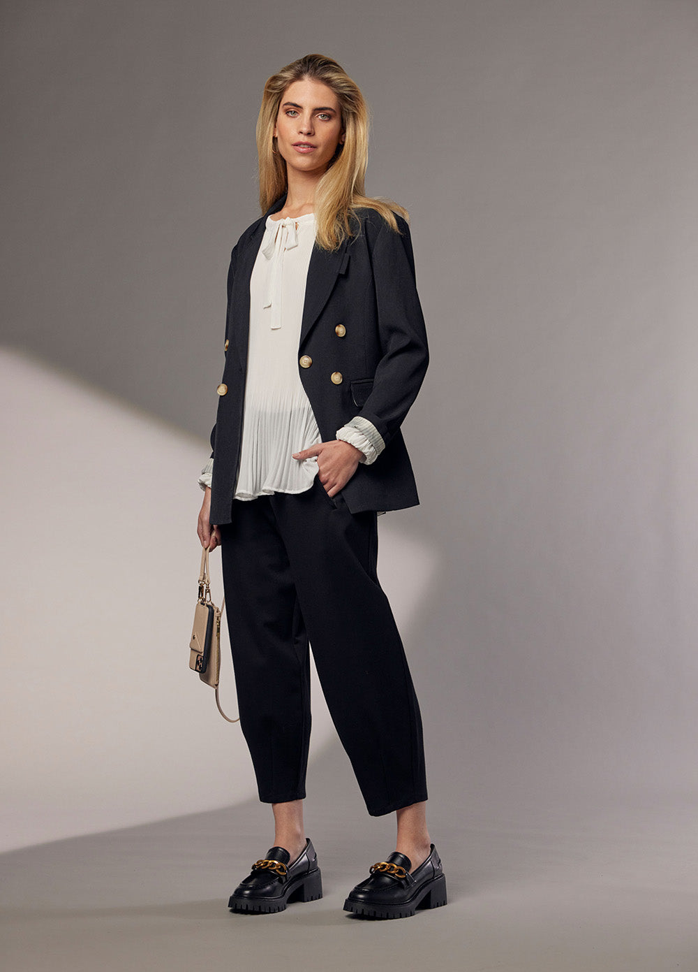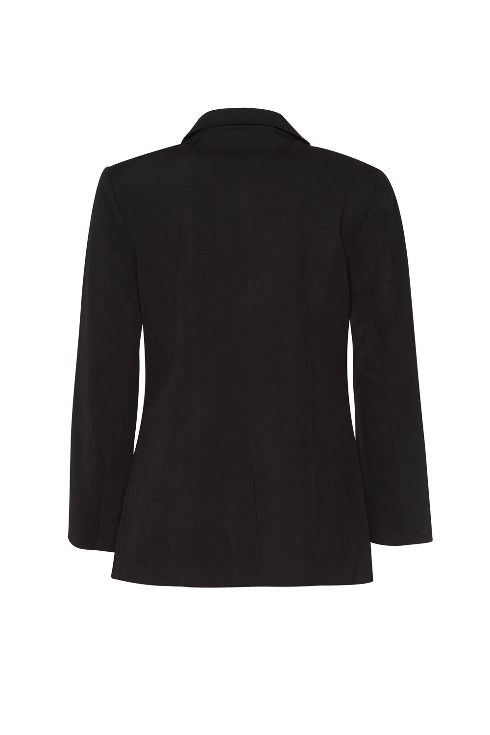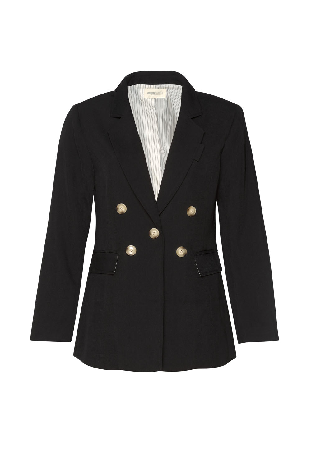 Everyday style double breasted classic blazer, with front pockets and faux horn buttons with a squared hemline and back vent. Fully Lined.