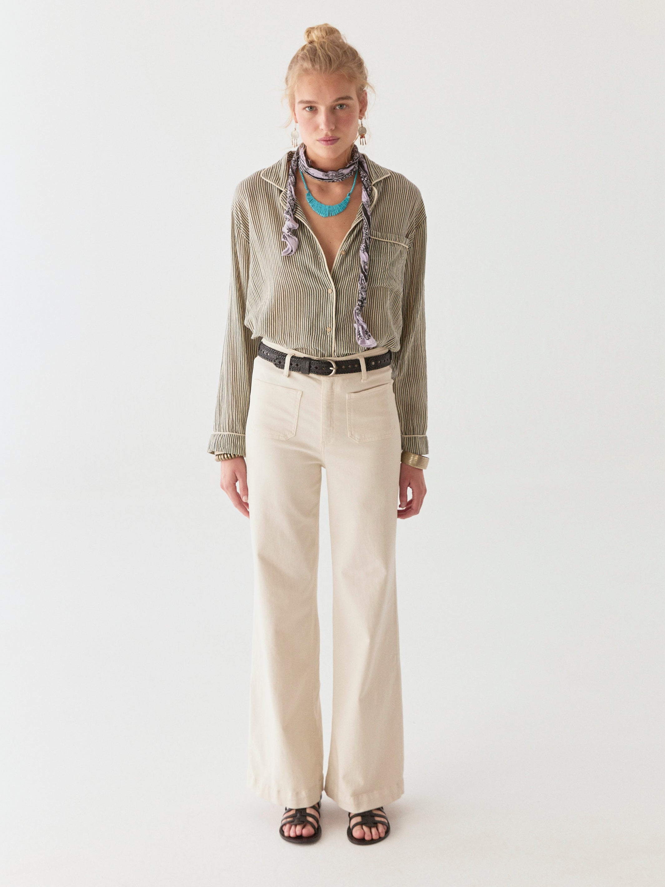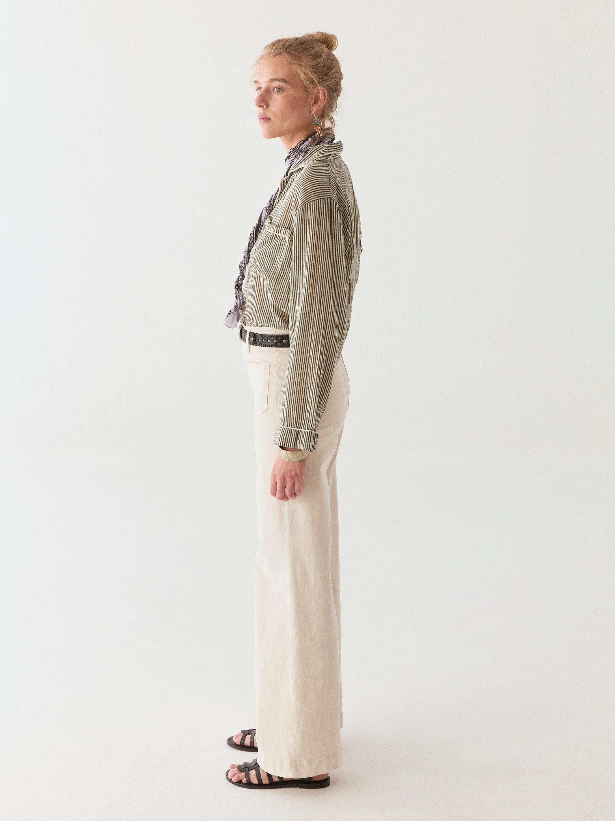 The piped collar and single chest pocket nod to tradition but refuse to feel proper. Worn loose or tucked, the blouse doesn’t try to impress—it’s a piece that moves with you, a quiet assertion of style without compromise.