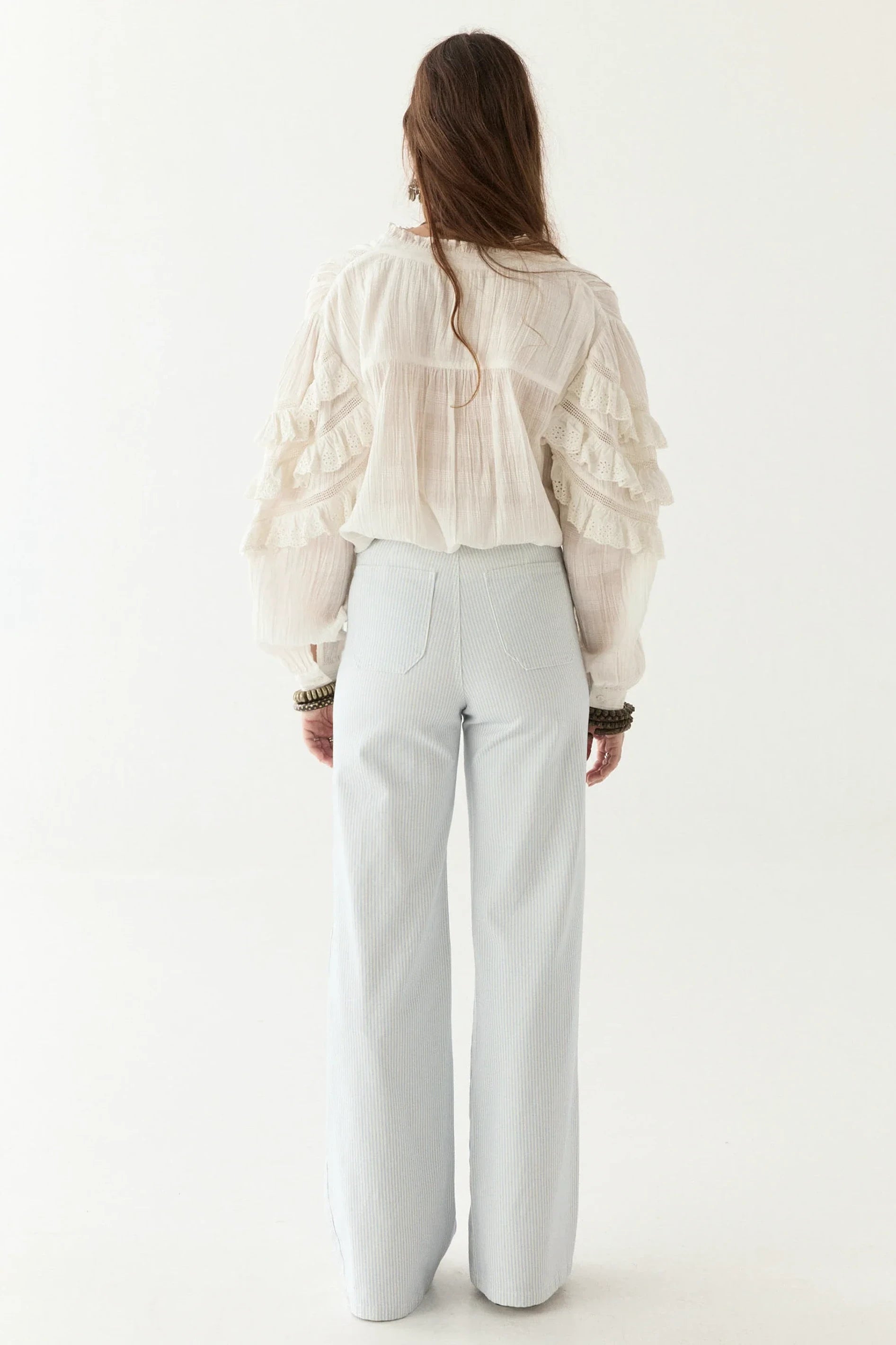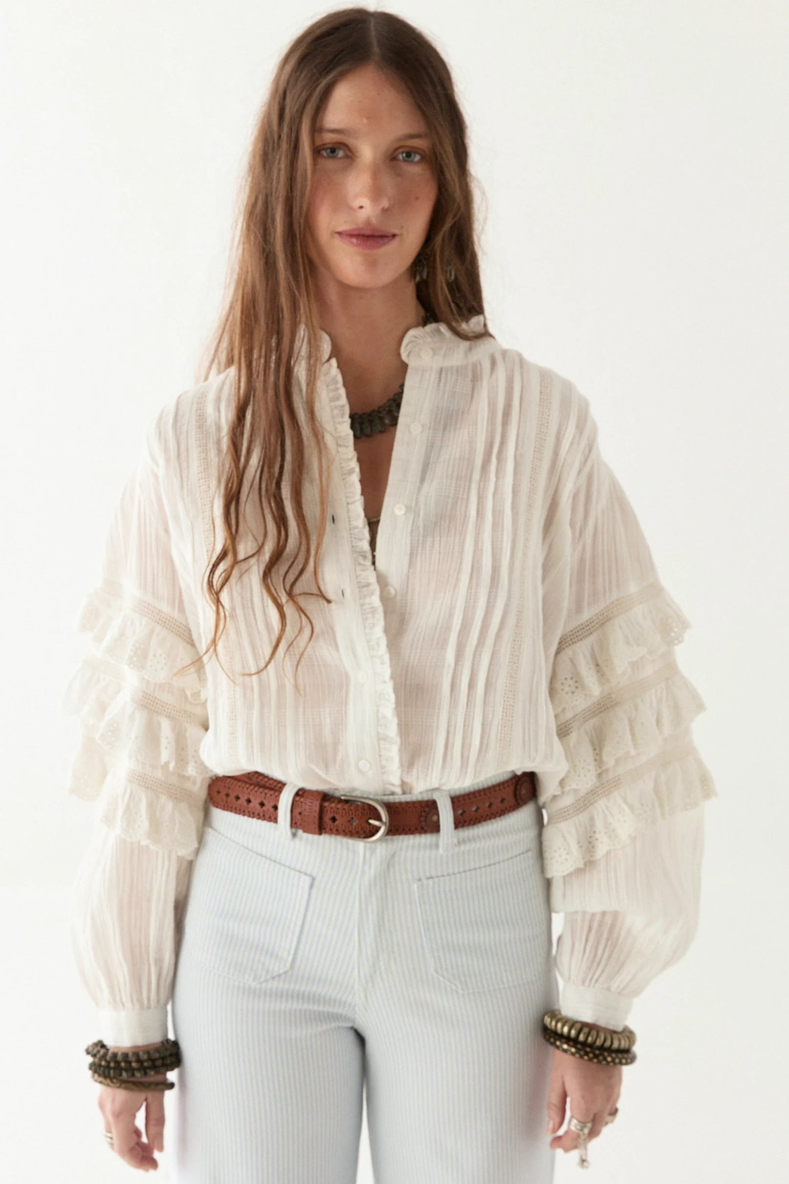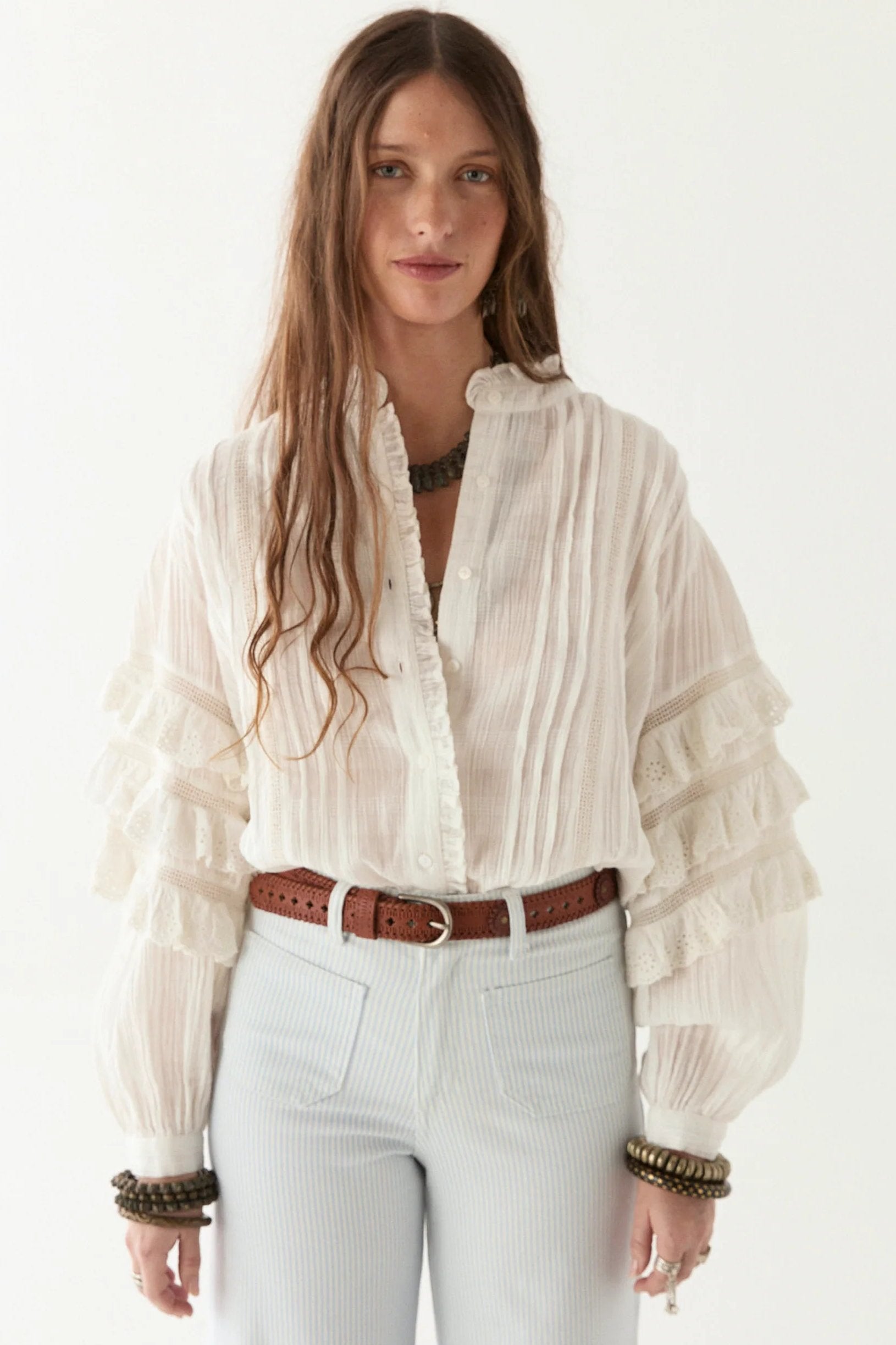 Cuban heat, sharp whites, and a rhythm that never slows. Cut from crisp cotton, threaded with schiffli embroidery that feels more like history than decoration. The sleeves? Tiered, structured, commanding space like a clave beat—layered, deliberate, never still.
