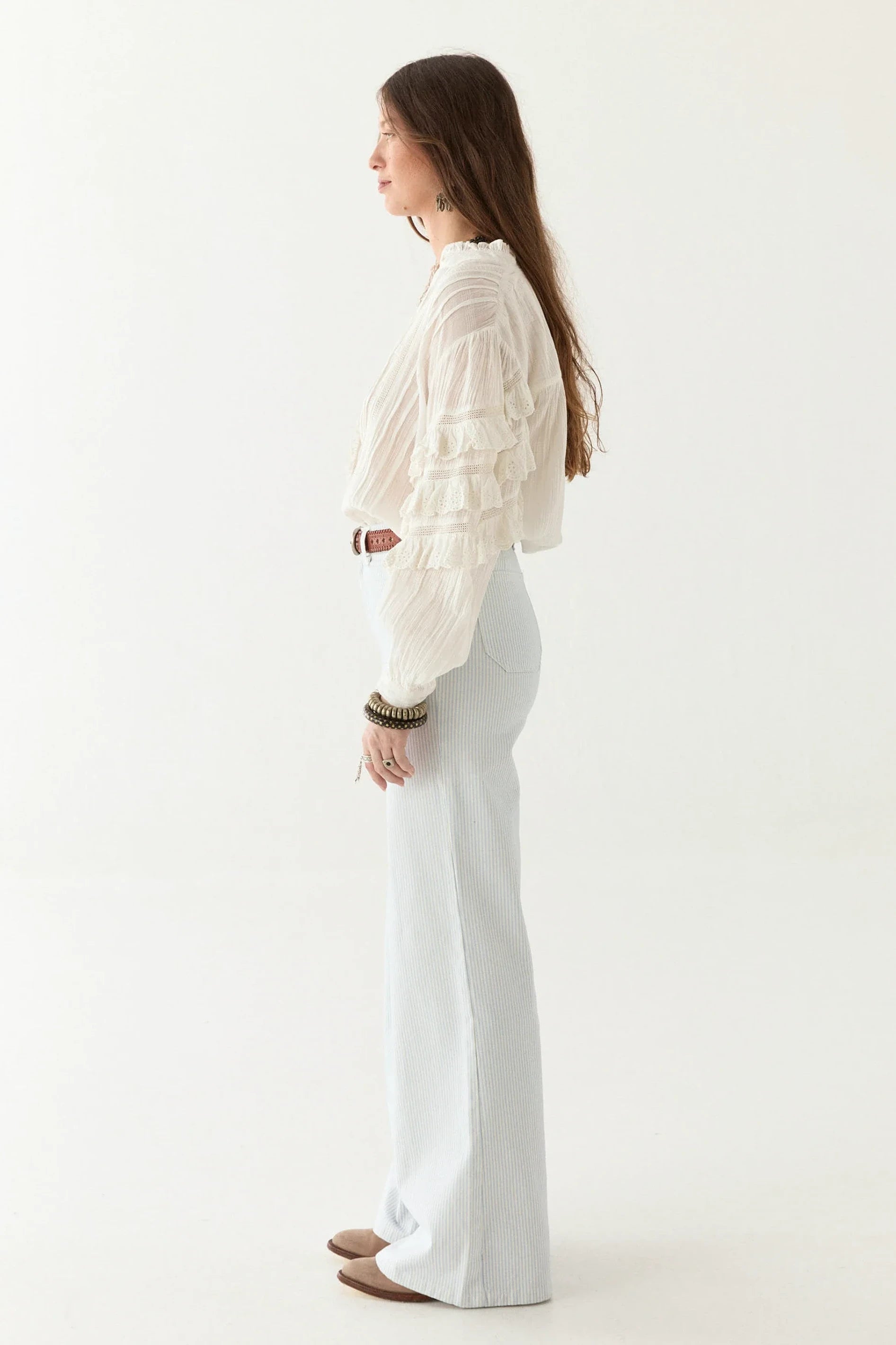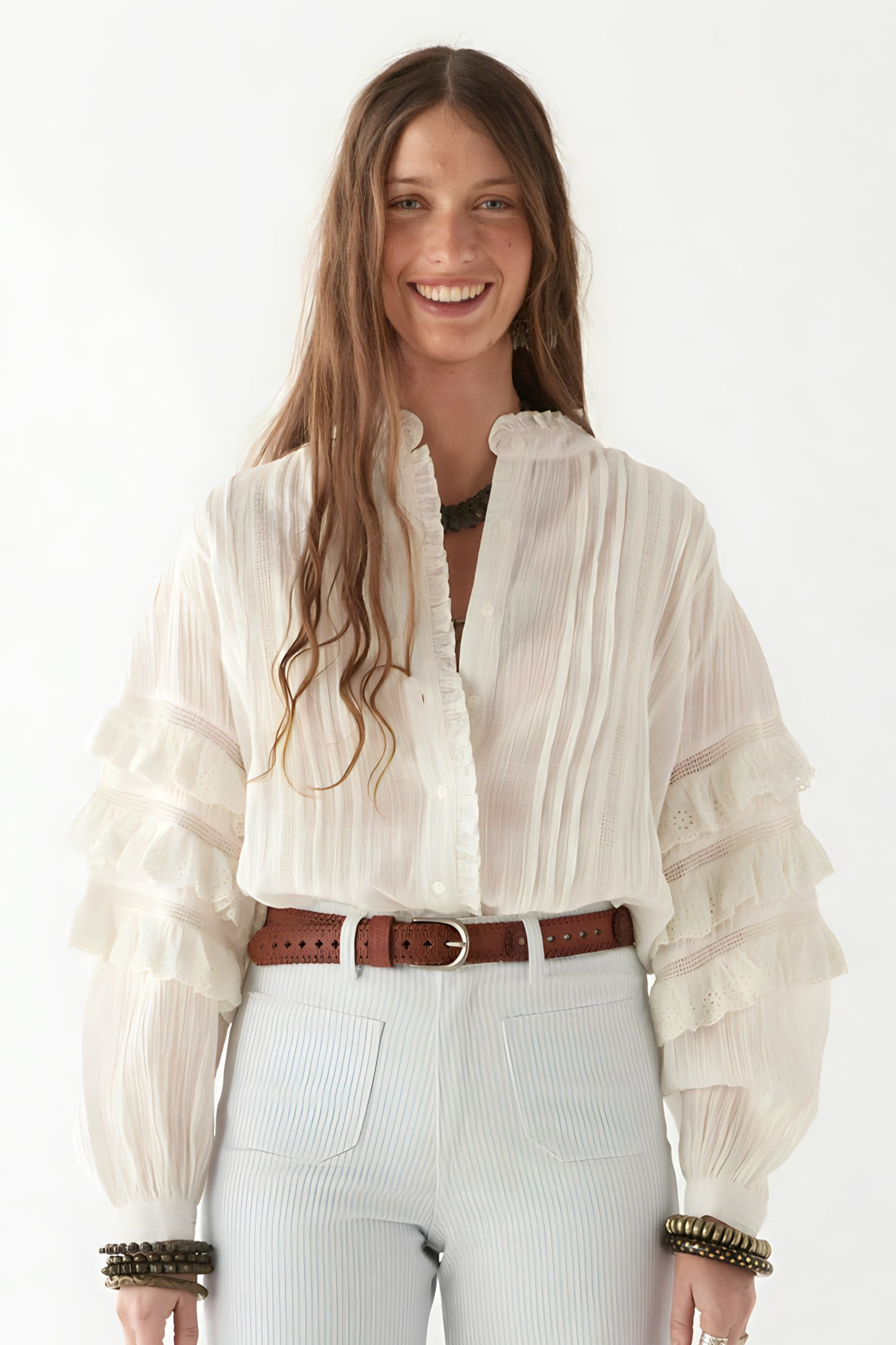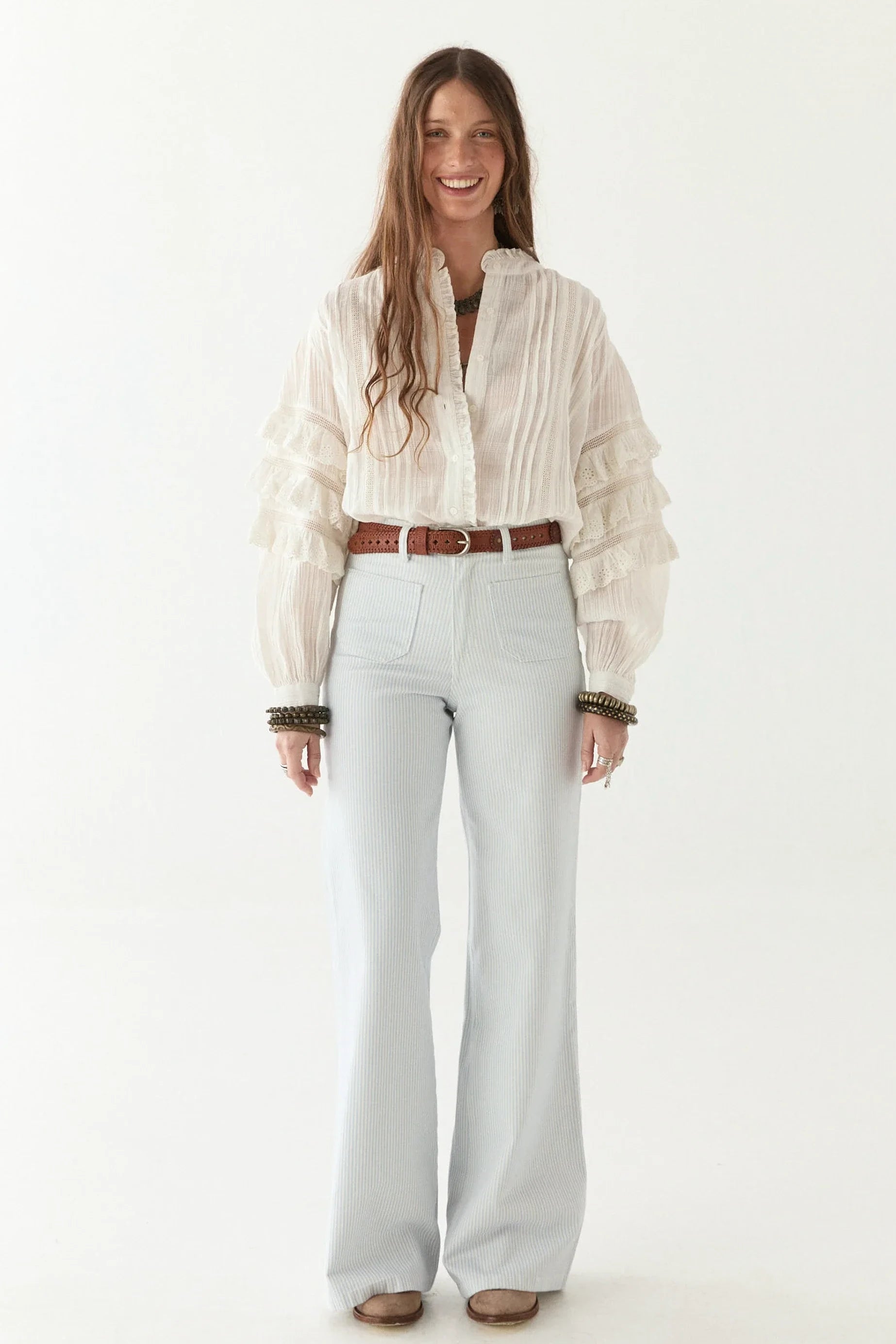 Cuban heat, sharp whites, and a rhythm that never slows. Cut from crisp cotton, threaded with schiffli embroidery that feels more like history than decoration. The sleeves? Tiered, structured, commanding space like a clave beat—layered, deliberate, never still.
