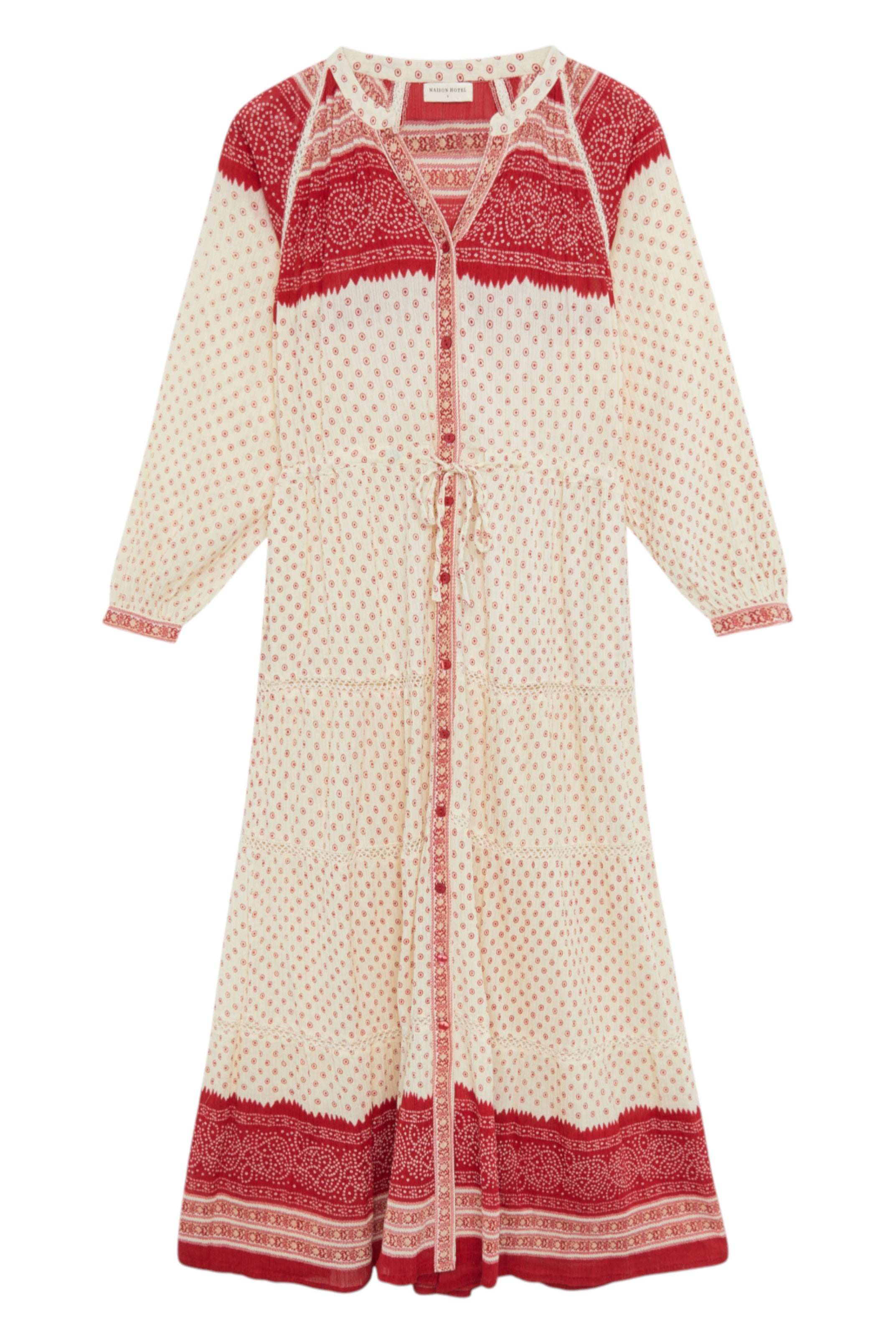 Made from lightweight, textured cotton, it moves with ease while keeping its structure. The geranium red micro-print on a washed cream base gives it a vintage, sun-worn feel—like something picked up in a forgotten boutique, not mass-produced. The bandana yoke and hemline detailing add just the right amount of edge, a nod to Western heritage but with a knowing smirk.