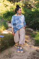 Meet the Luxe Tee. We’ve taken a wardrobe staple — the humble t-shirt — and elevated it to a chic, easy piece with an oversized cut that’s destined to become a style you’ll reach for all year long! Inspired by poet Leonard Cohen’s famous quote “There is a crack in everything, that's how the light gets in”, this design celebrates the ways our experiences shape us, and the perfect beauty of imperfection. Created using pieces of Delft tile from the 1700’s — including two Italianate landscape scenes — we chose to leave in the cracks and slight imperfections from the original ceramic in our final print. The two patterns in the trim come from an 1867 British book on classical ornamentation, and an earthenware plaque from the Netherlands painting. 100% viscose (derived from plant fibres such as wood and bamboo). Non-stretch. Meaures: S/M length (front) 64cm, (back) 68cm, width (across back) 56cm. L/XL length (front) 73cm, (back) 78cm, width (across back) 61.5cm. boho gypsy lounge holiday