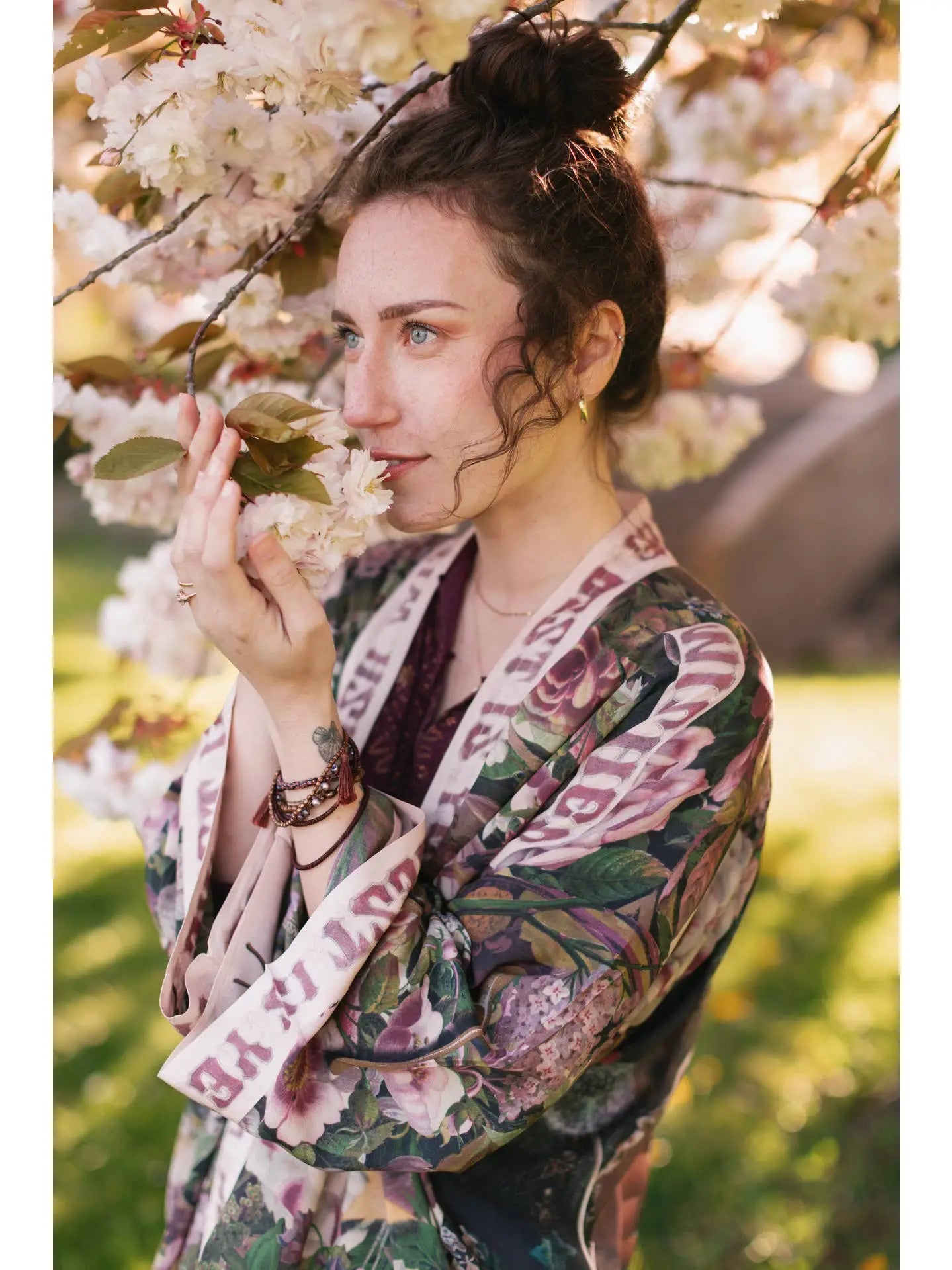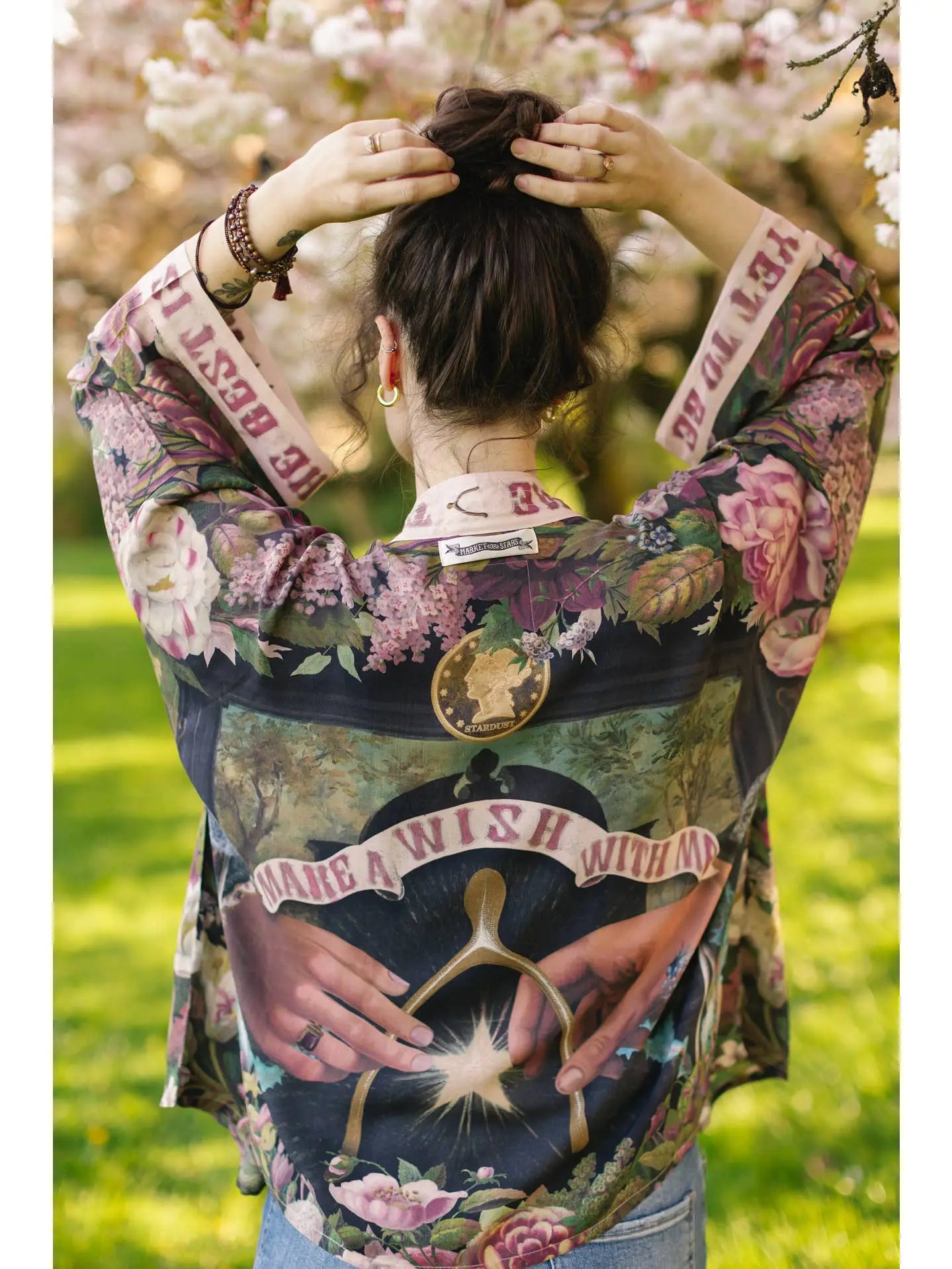 Lighthearted, whimsical, and full of magic — this design was so much fun to create! We collaged several pieces of art from the eighteenth and nineteenth centuries that depict symbols of good luck — including a gold wishbone from a Victorian postcard, a coin design from 1840, an evening star, and a beautiful 1755 painting of a dandelion waiting to be wished on. The banners and words reading “Make a wish with me, the best is yet to be” and “Best Wishes” are adapted from an 1880’s lithograph, and the lilacs and spring flowers adorning the whole design are symbols of hope and renewal. May this piece bring you luck and joy whenever you wear it! 100% blended viscose. Machine wash gentle or handwash and hang to dry.