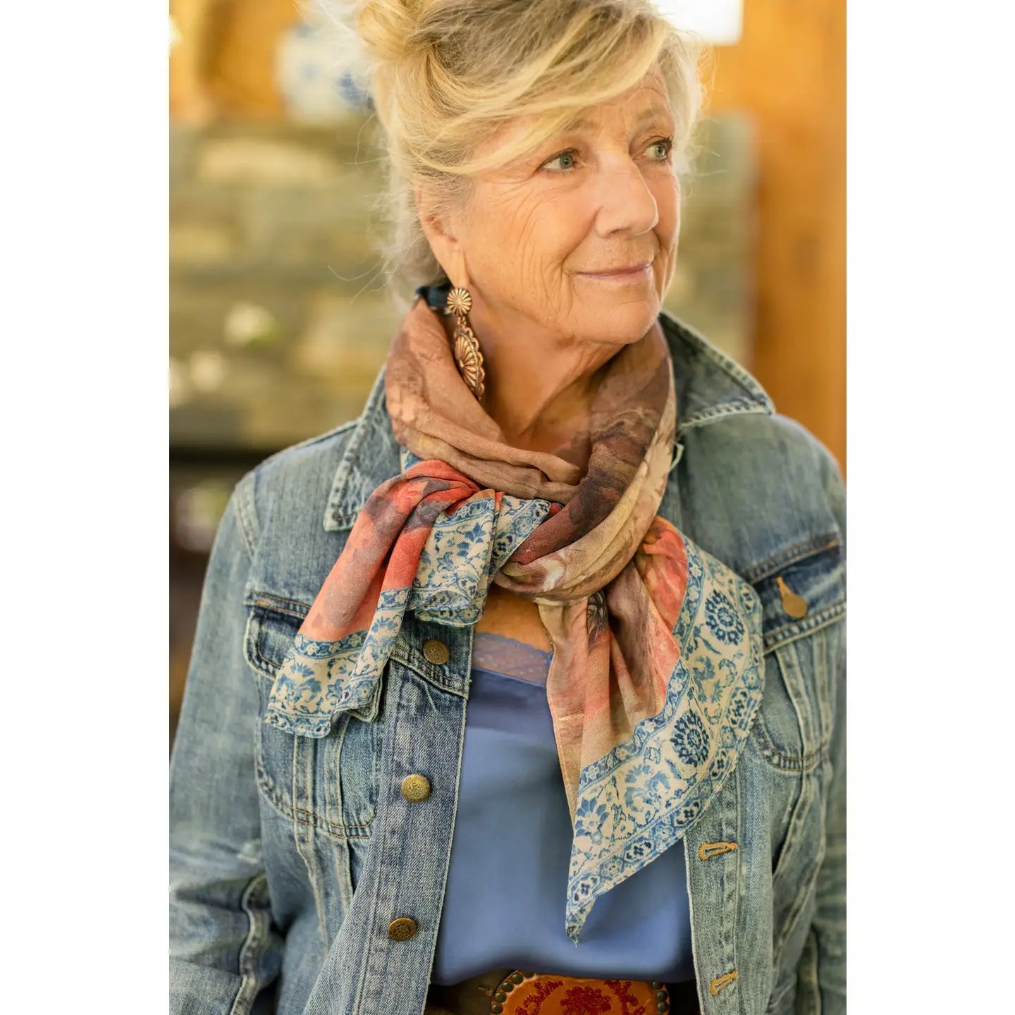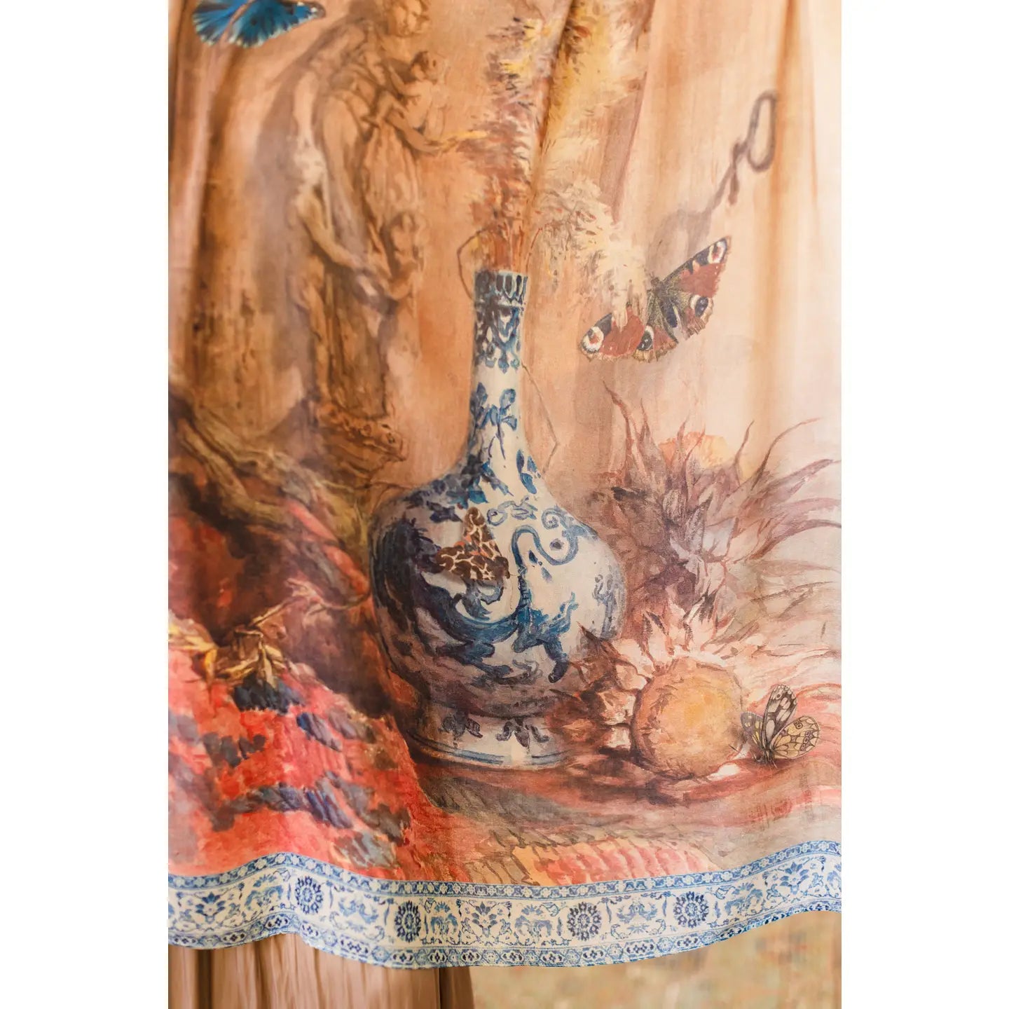 We've modelled the size and weight after our favourite vintage French scarves to create chic, easy to wear designs for every day use. Crafted from viscose, the fabric is a lighter, airier weight than our kimonos, with the same beautifully soft feel. They make a wonderful gift. About the Print: Exotic, painterly, and chic — this piece is for the travellers and dreamers who love to collect stories wherever they roam. We brought together a beautiful mix of prints that evoke the rich texture of a tapestry. The watercolour painting with its elegant vase and dried sunflowers was done by Dutch artist Maria Vos in 1879. We mixed Vos’s work with several other art pieces, including a late 1700’s paper block-print, a Turkish carpet, and the design from a French antique Chinoiserie plate. 100% viscose (derived from plant fibres such as wood and bamboo). Handwash, hang to dry. 68cm x 155cm.