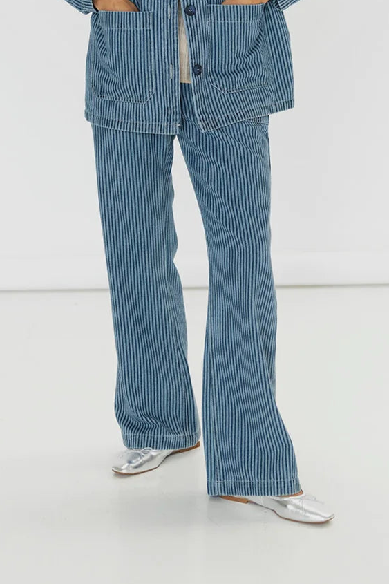 The popular Darling pants in retro striped denim is back. The pants have an elastic waist, straight legs, slanted pockets at front and two pockets at back. The quality is soft which makes these pants super comfortable. You can wear the pants with the matching DONYA jacket.