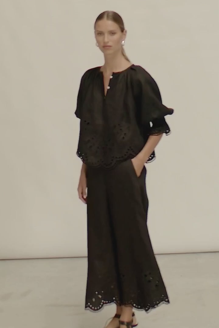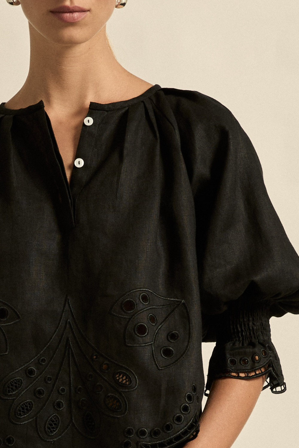 The Dawn Top brings a fresh approach to volume and texture, showcasing bespoke embroidered artistry in a vibrant sun-ripened melon hue. Crafted from 100% linen, it features a relaxed silhouette with a soft raglan sleeve, creating an effortless sense of ease. Tuck detailing at the neckline adds a gentle drape, while the scalloped hem and embroidered floral motifs lend a touch of feminine polish. Style it as a set with the Jetty Skirt for an elevated, coordinated look—or pair it with denim for a refined take on casual dressing.