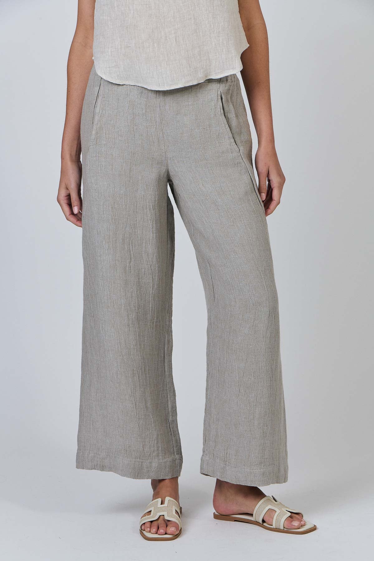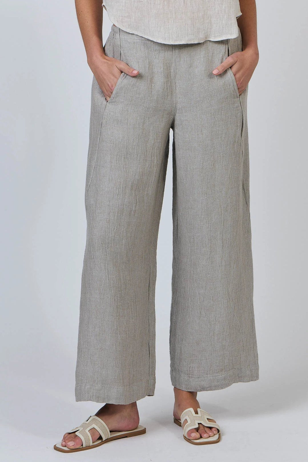 Elevate your wardrobe with the Dee Pant Crafted from 100% breathable linen, this full-length, wide-leg pant offers a tailored look that effortlessly transitions from day to night. Two front pockets and gathered detailing at the back waistband add functional and stylish touches. Perfectly pairs with any top for a chic and flattering ensemble.